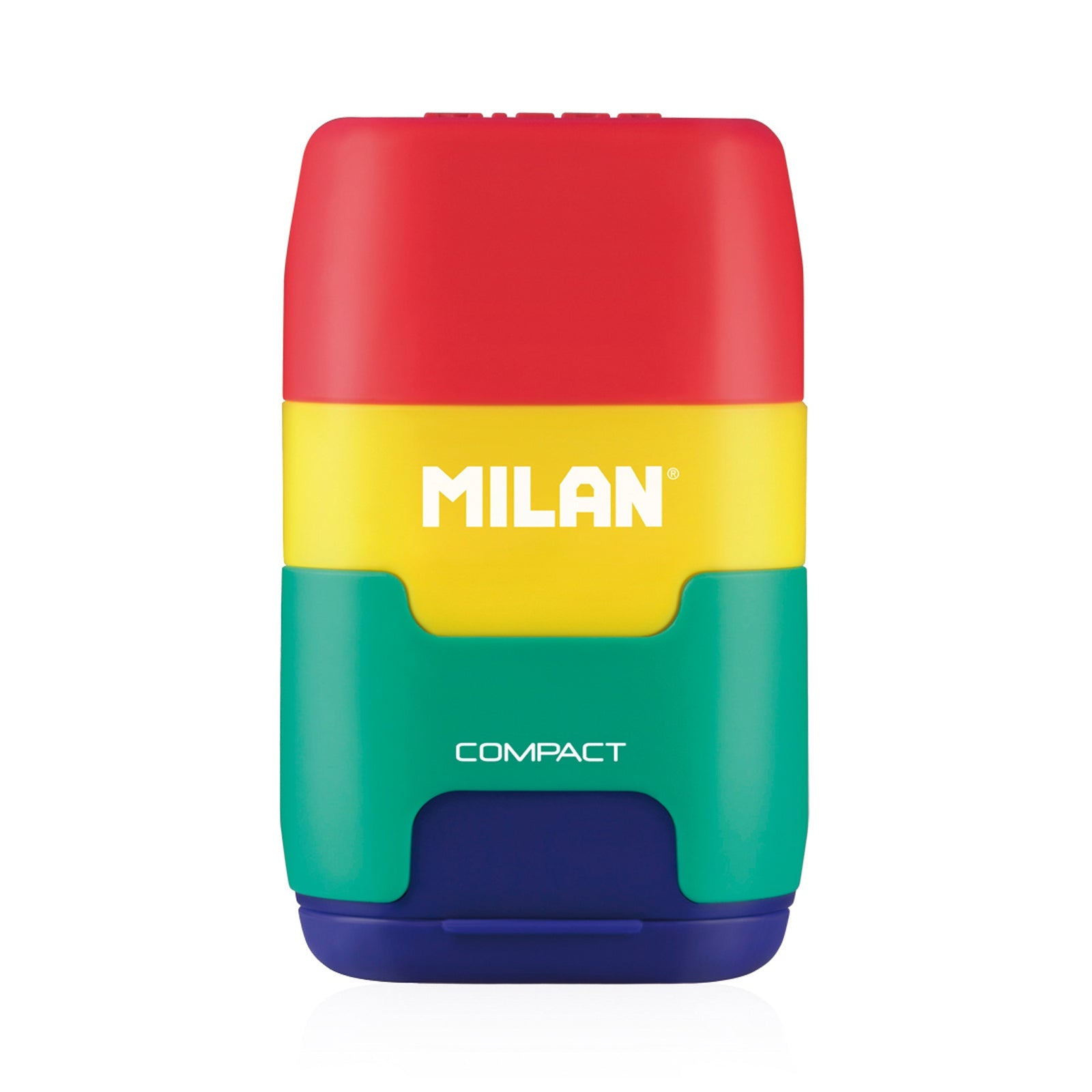 Caja expositora 24 afilaborras Milan Compact Mix. Combinación de goma y sacapuntas doble (uno estándar y otro MAXI). Goma cuadrada suave de caucho sintético tipo "miga de pan". El sacapuntas tiene una cuchilla de acero al carbono afilada y resistente, ideal para todo tipo de lápices. Artículo con cuchilla de seguridad. Este sistema evita que se pueda separar la hoja del cuerpo del sacapuntas, siendo óptimo para uso escolar y para llevar en el estuche. Diseñado en España por el propio departamento de I+D de MILAN. Colores surtidos disponibles: rojo, verde, amarillo y azul.