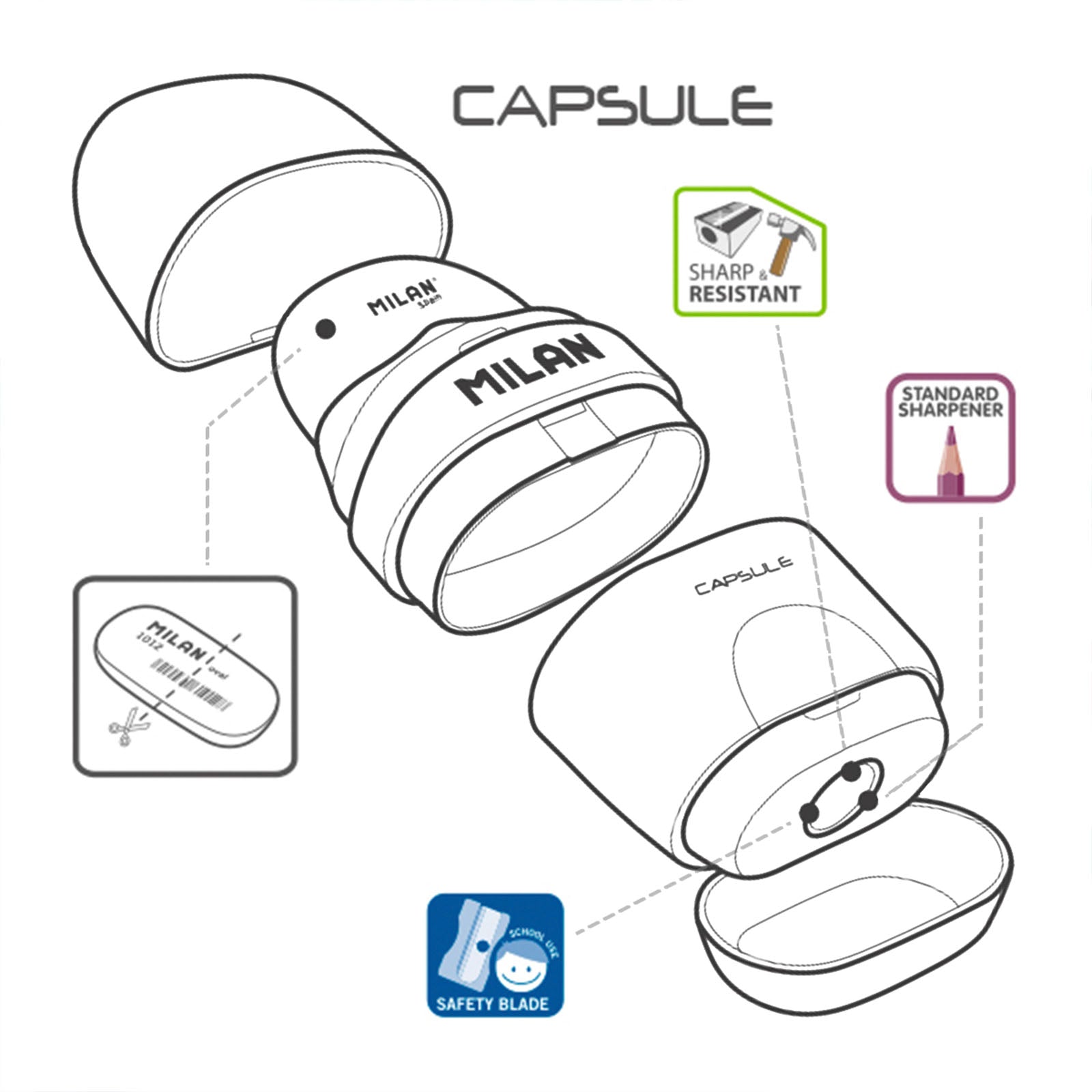 Combinación de goma y sacapuntas estándar con depósito. Goma ovalada suave de caucho sintético tipo 'miga de pan'. El sacapuntas tiene una cuchilla de acero al carbono afilada y resistente, ideal para todo tipo de lápices. Artículo con cuchilla de seguridad. Este sistema evita que se pueda separar la hoja del cuerpo del sacapuntas, siendo óptimo para uso escolar y para llevar en el estuche. Diseñado en España por el propio departamento de I+D de MILAN. Colores surtidos disponibles: azul, amarillo y rosa