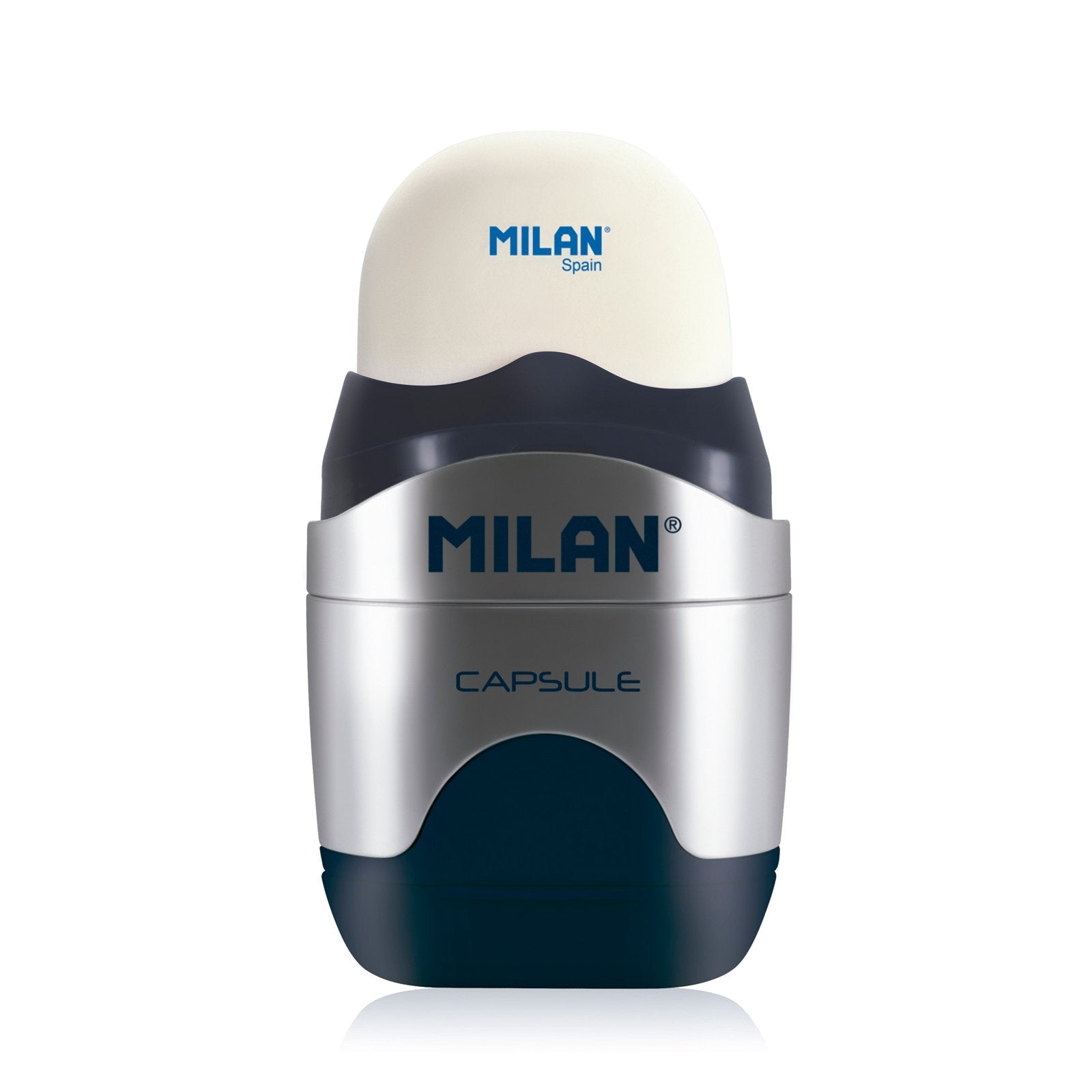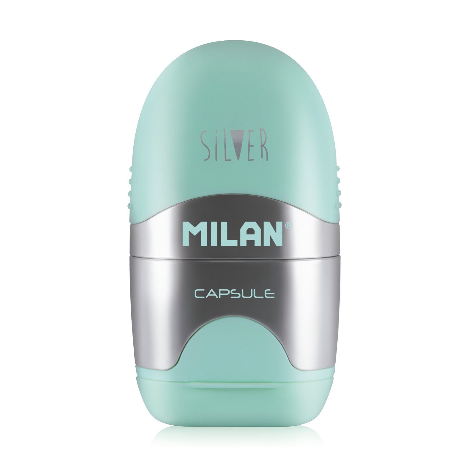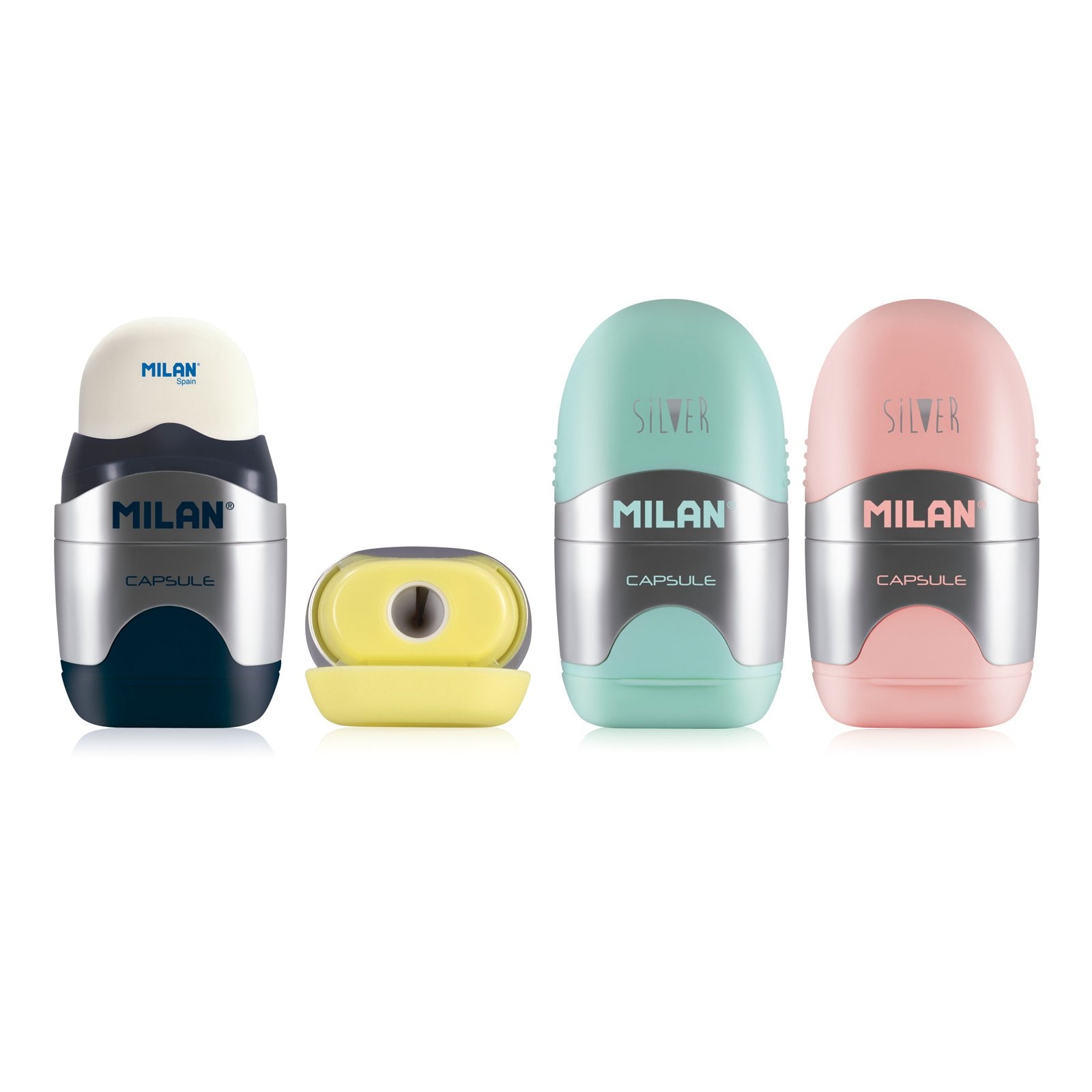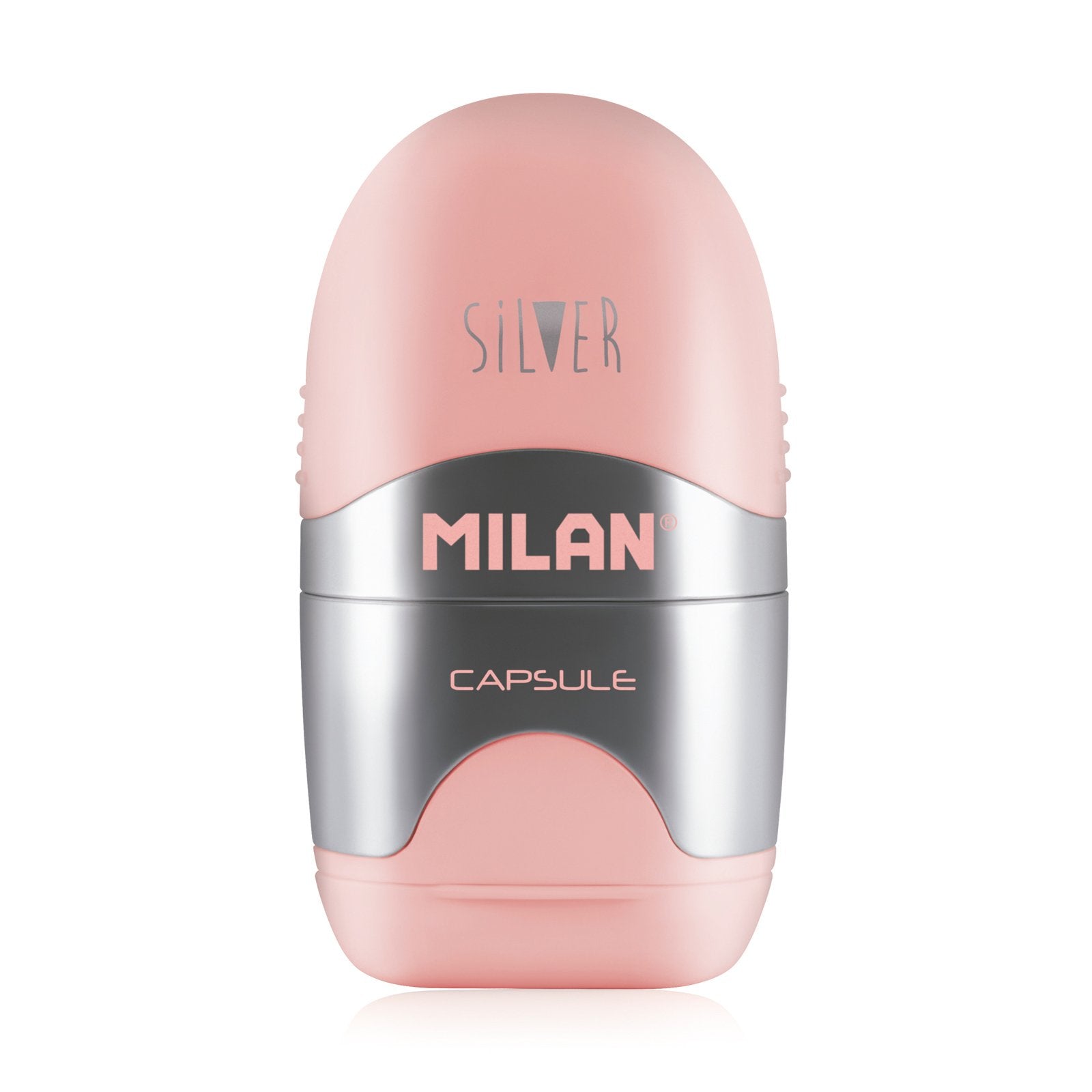 Combinación de goma y sacapuntas. El sacapuntas tiene una cuchilla de acero al carbono afilada y resistente, ideal para todo tipo de lápices. Artículo con cuchilla de seguridad. Este sistema evita que se pueda separar la hoja del cuerpo del sacapuntas, siendo óptimo para uso escolar y para llevar en el estuche. Diseñado en España por el propio departamento de I+D de MILAN. Colores surtidos disponibles: rosa, verde, azul, amarillo.