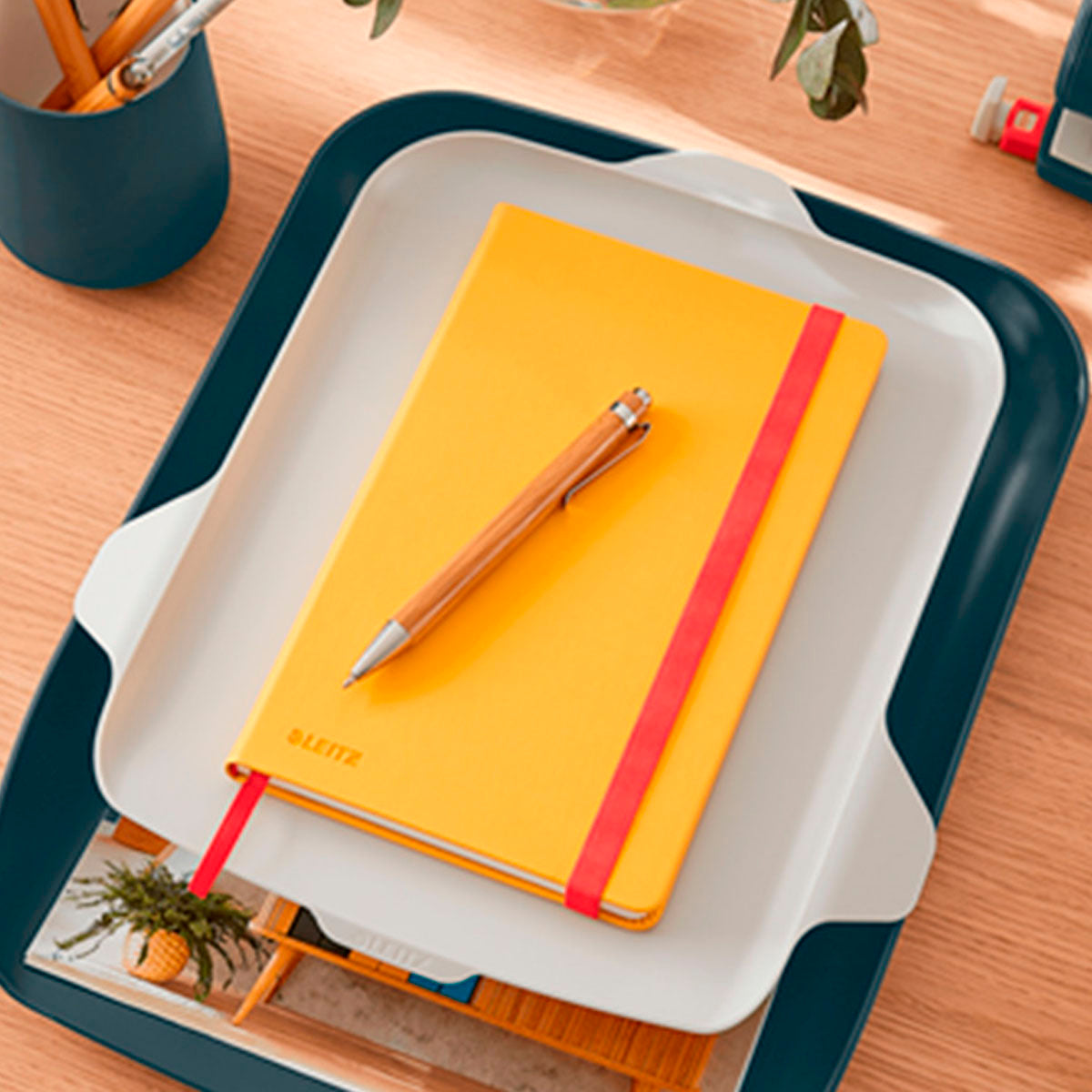 Combinar una bandeja de sobremesa con un estante de almacenamiento adicional que se apoya en la parte superior, proporciona un acceso rápido a lo esencial del día a día. Almacena tanto tus documentos importantes como tu tableta, móvil u otros accesorios