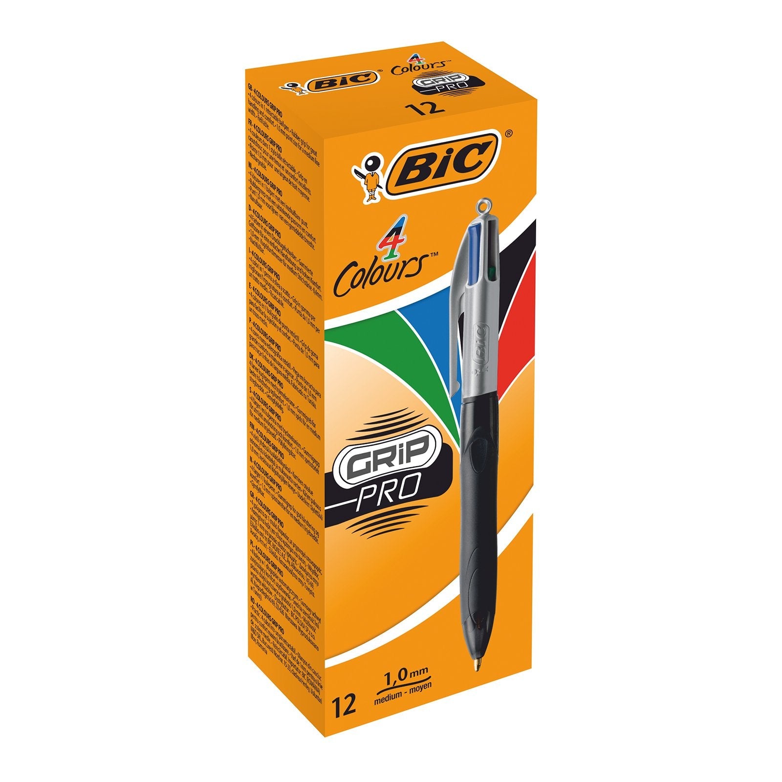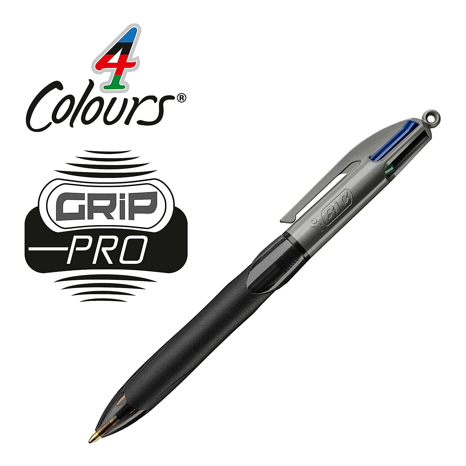 Estos bolígrafos BIC GRIP PRO tienen un agarre que los hace fáciles de sujetar y aún más cómodos al escribir. El cuerpo gris y negro de 2 tonos crean un instrumento elegante hecho para la escritura de calidad. Estos bolígrafos BIC 4 colores de larga duración son recargables y cada uno de los cartuchos de tinta azul, negro, rojo y verde puede escribir durante un promedio de 2 km.