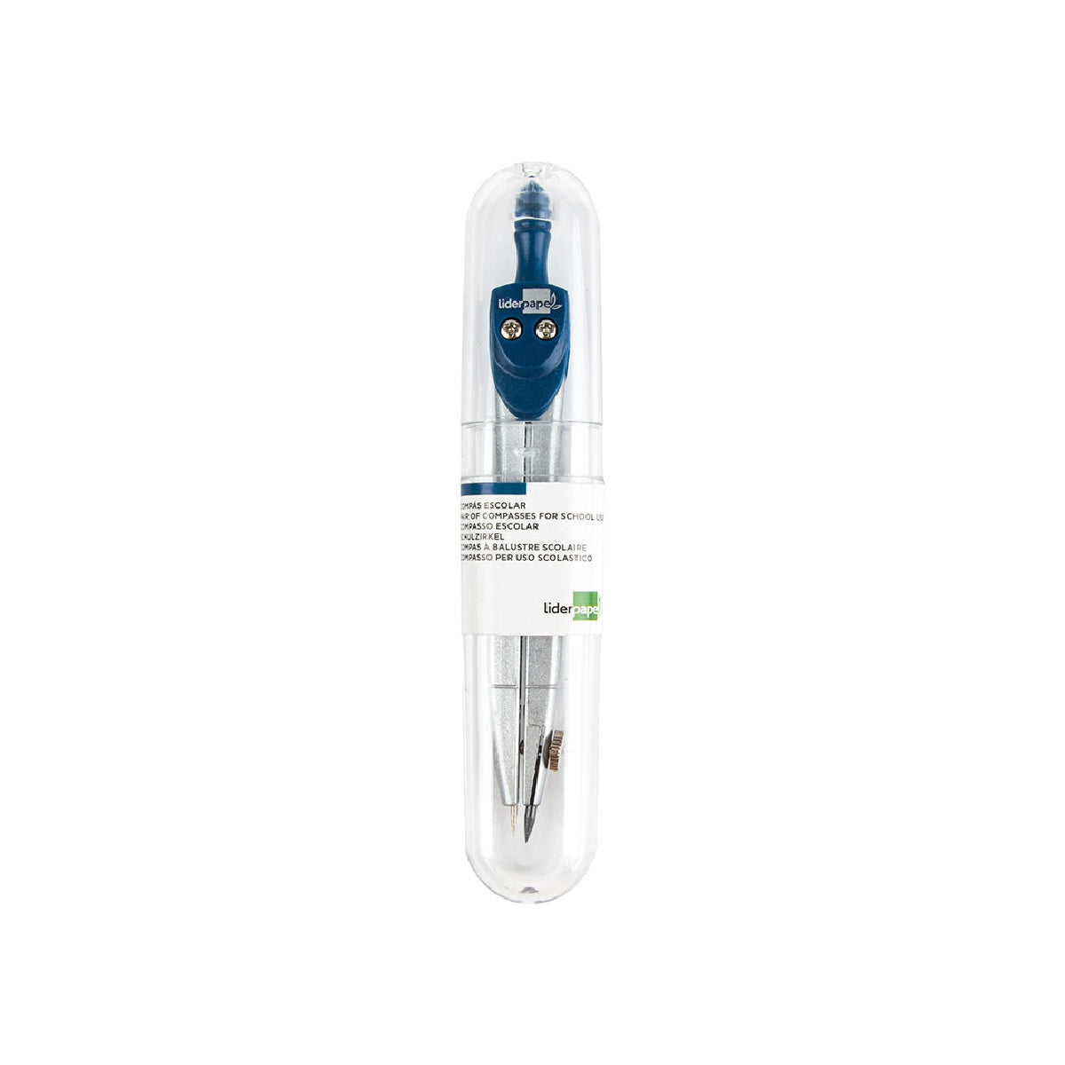 Compás indicado para uso escolar. Longitud: 12.5 cm. Circunferencia: 34 cm.