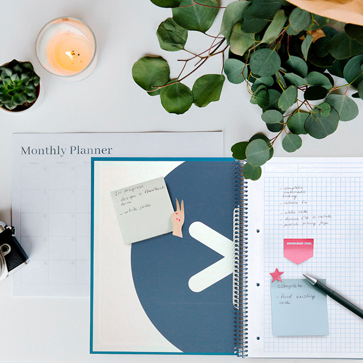 Tapa de cartón entre-colado de 1,5 mm de espesor, forrado a una cara con papel estucado mate extra-suave y reserva de barniz uvi. Interior de portada impresa y plastificada mate. Gran resistencia y rigidez, perfecta para poder escribir en la libreta sin necesidad de apoyarla.