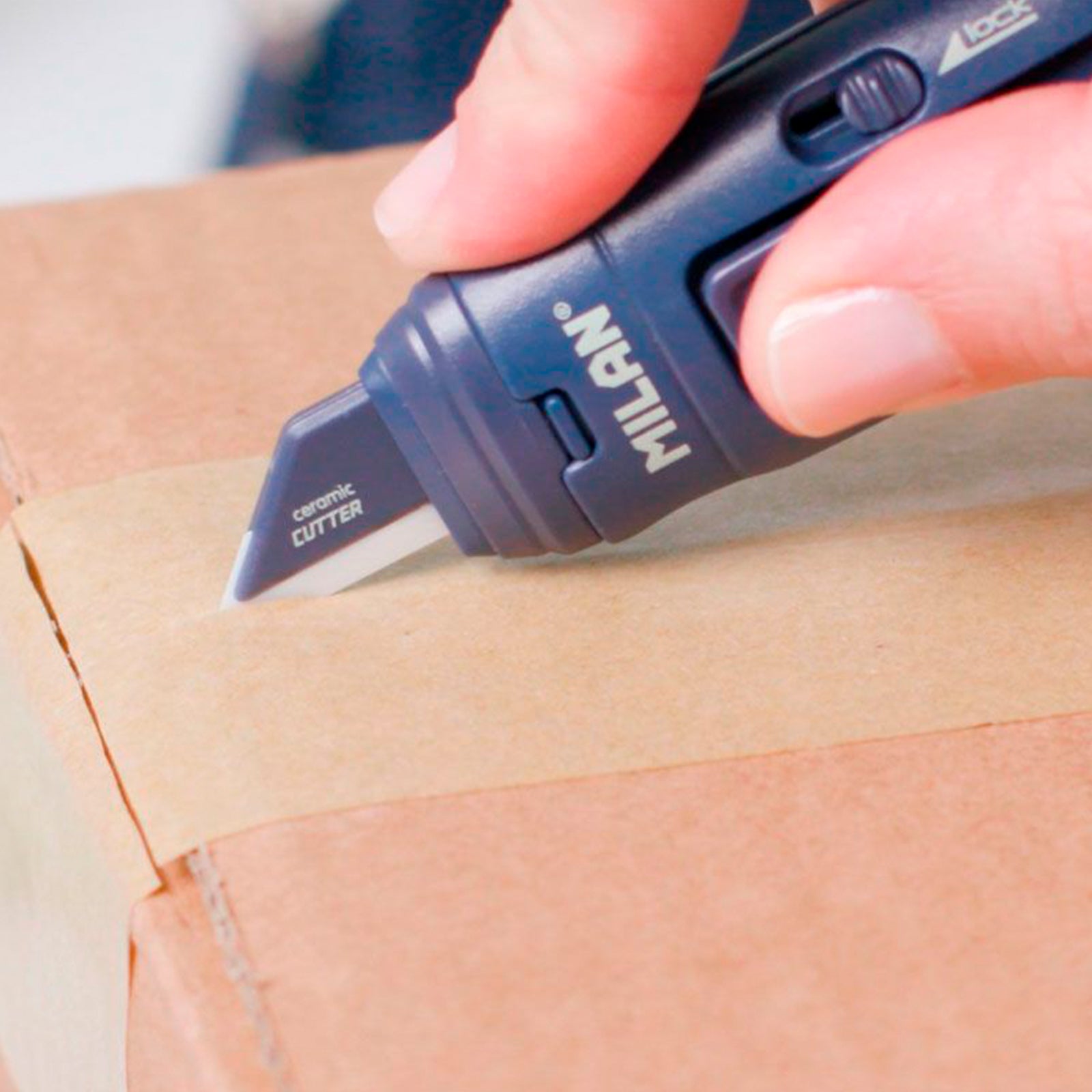 Caja con 8 Cúters con hoja de cerámica reemplazable. Diseño STICK, serie 1918 en color azul marino. Cuchilla con protector y sistema de bloqueo de seguridad. Botón deslizador con dos posiciones. De pequeño tamaño, tipo 'de bolsillo'. Con su forma ergonómica, es perfecto para manualidades o para abrir paquetes. La hoja cerámica corta distintos tipos de material. Dispone de un ojal para poder ser colgado. Hojas cerámicas de recambio disponibles.