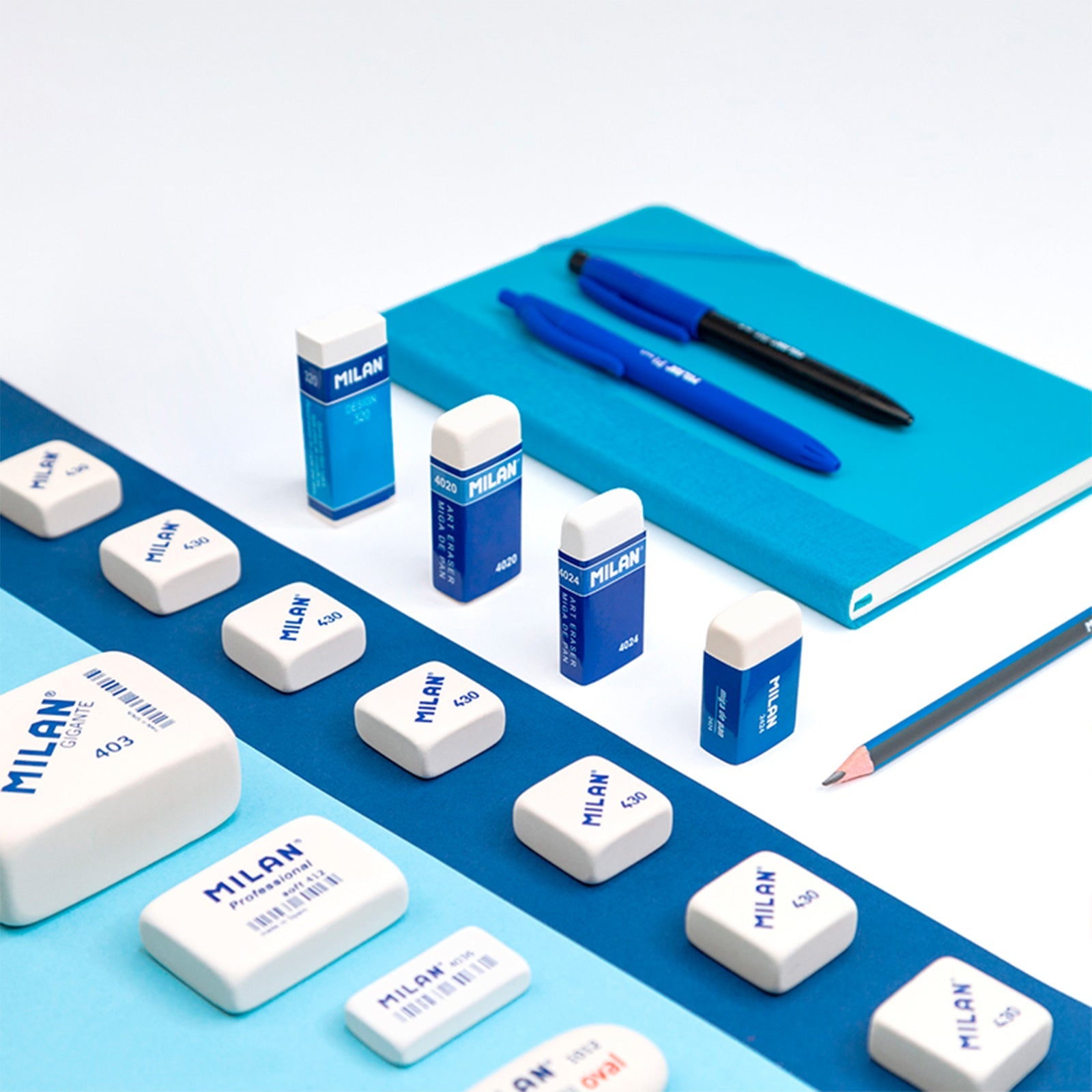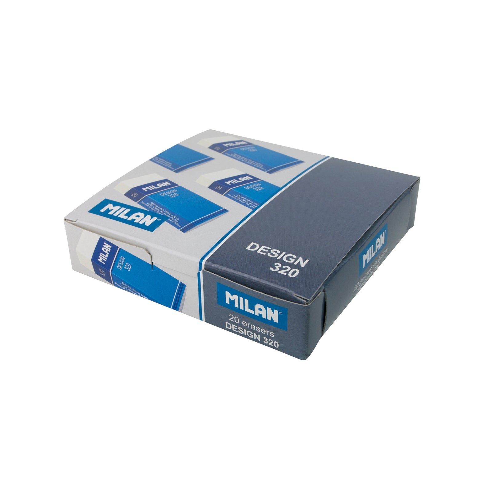 Caja de 20 Gomas de Borrar Nata 320. Goma nata de plástico blanca, para borrar lápiz sobre todo tipo de superficies. Gomas con faja de cartón azul envueltas individualmente. Las gomas de borrar MILAN están fabricadas en España desde 1918.
