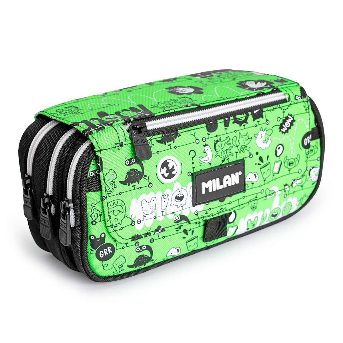 Estuche portatodo triple MILAN Tandem de amplios apartados y gran capacidad. Cuenta con 4 cremalleras, 3 principales y otra en la solapa una solapa exterior que incluye tirador de tela y cierre magnético de botón. Cierres de cremallera ancha y resistentes con tiradores metálicos con recubrimiento de goma para mayor confort.