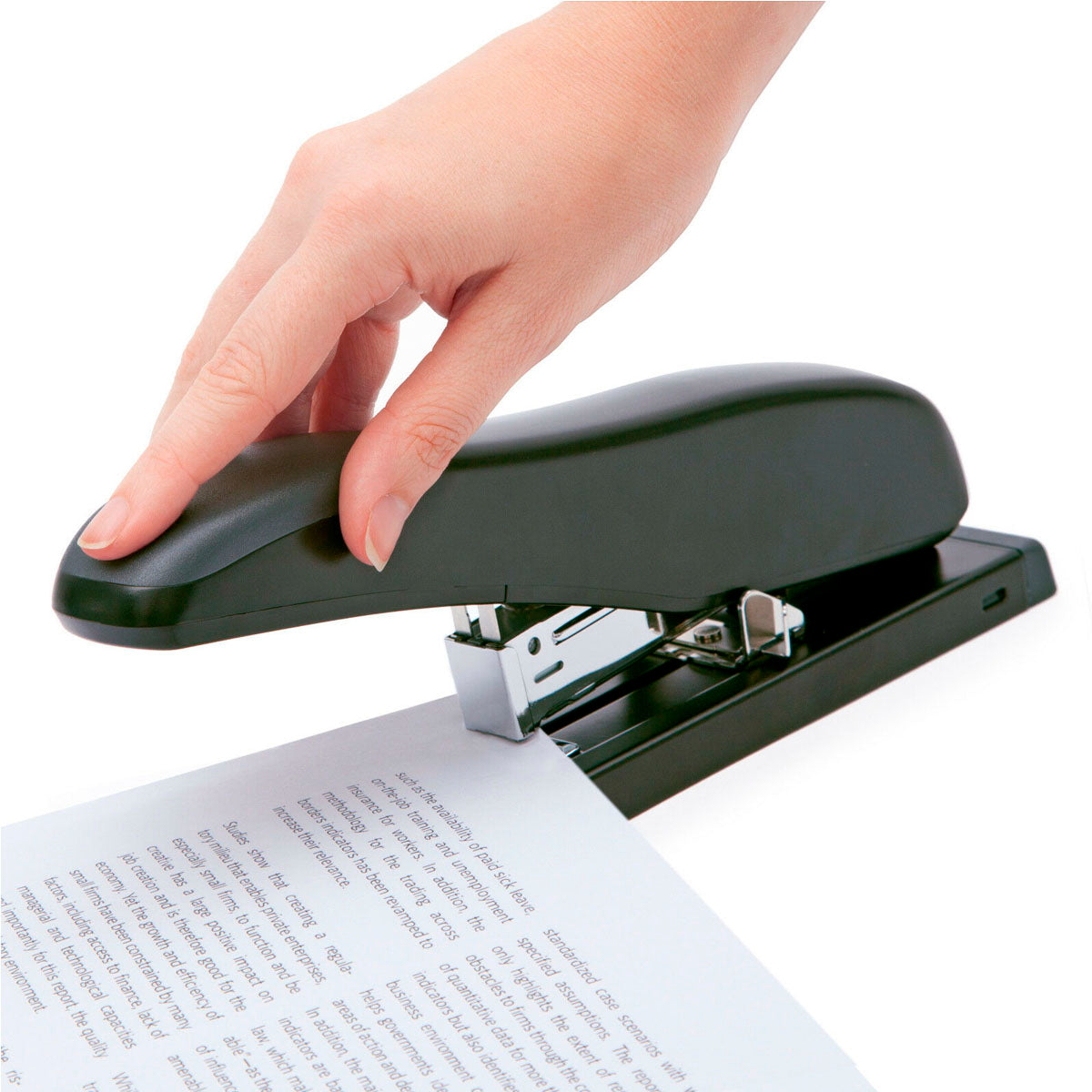 Grapadora de carga superior con guía de papel con sistema de bloqueo y mango de goma para asegurar un agarre suave y cómodo.