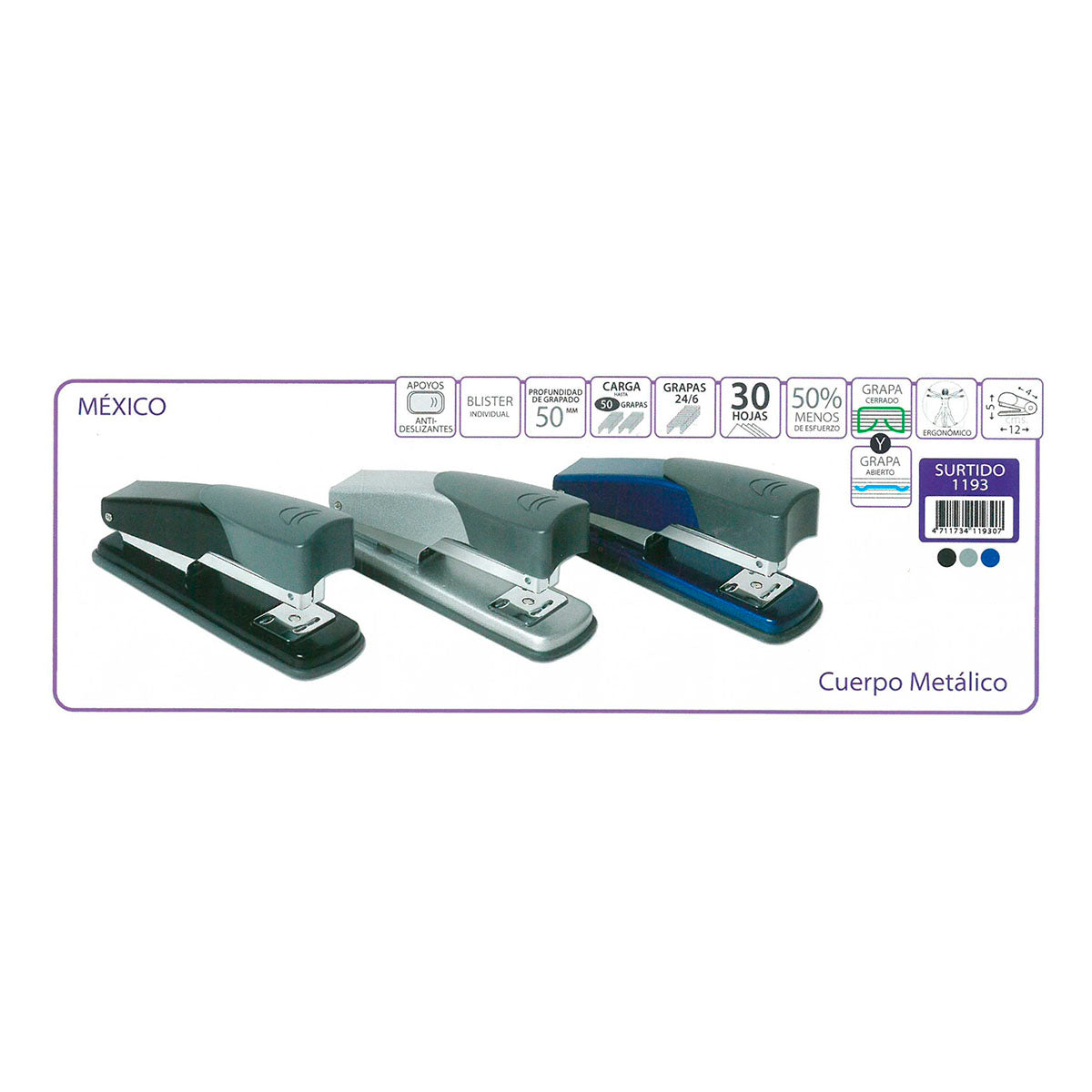 Grapadora de carga superior de metal con apoyos recubiertos de caucho anti-deslizante con carga de hasta 50 grapas. Disponible en 3 Colores. Referencia: 1193