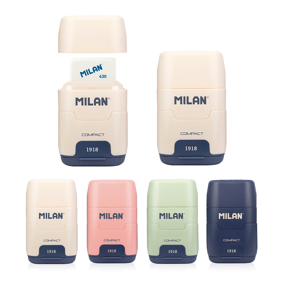 Afilaborra MILAN COMPACT serie 1918, una combinación de goma de borrar y sacapuntas doble (uno estándar y otro MAXI) con depósito. Incluye dos gomas de borrar 430 de recambio, ¡para que no te quedes sin!