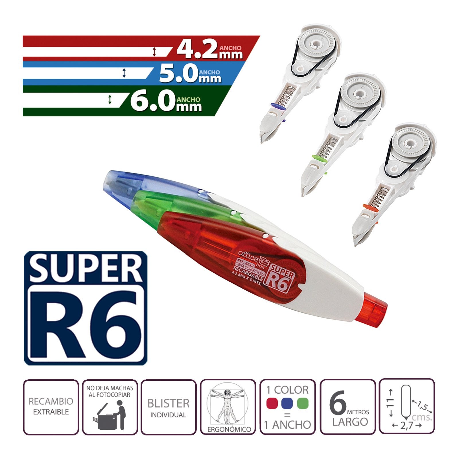 Pack de 2 cintas correctoras SDI Super R6 de 6 mm de ancho. Tienen un diseño ergonómico y cuentan con un pulsador para poder esconder en extremo evitando así que se estropee la cinta cuando no se está usando.