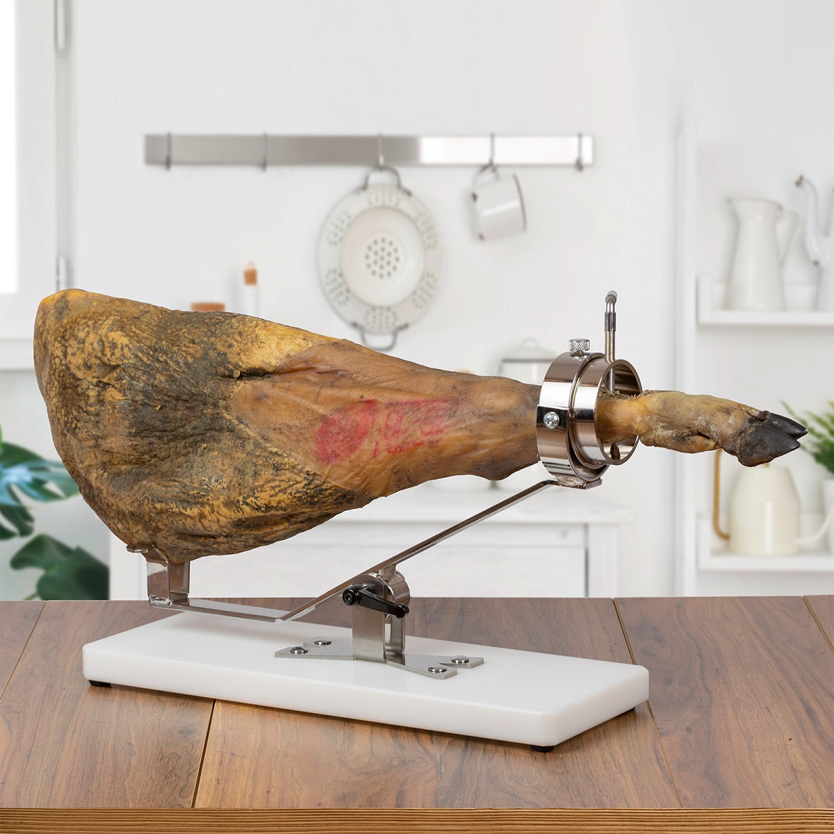 Su sistema de casquillos giratorios permiten girar el jamón los grados que se desee sin necesidad de soltar la pata. La sujeción de la punta tiene forma de V y no lleva pincho para evitar perforar el jamón y/o dañarlo. Es un jamonero muy versátil, manejable y cómodo de usar y limpiar.