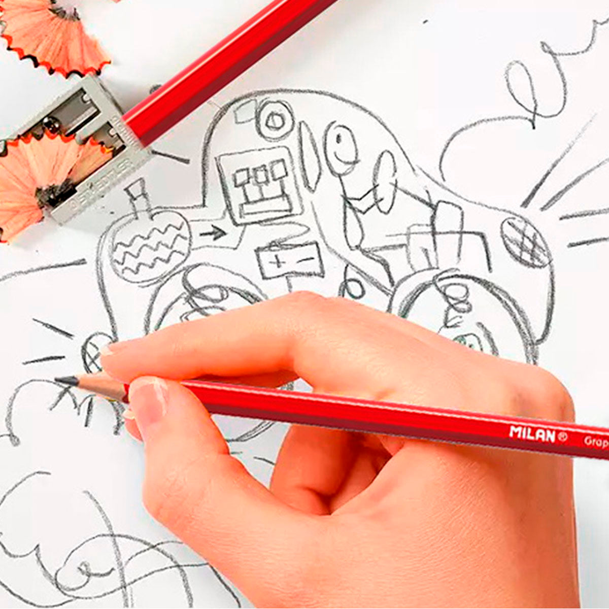 Artículo con cuchilla de seguridad. Este sistema evita que se pueda separar la hoja del cuerpo del sacapuntas, siendo óptimo para uso escolar. Diseñado en España por el propio departamento de I+D de MILAN.