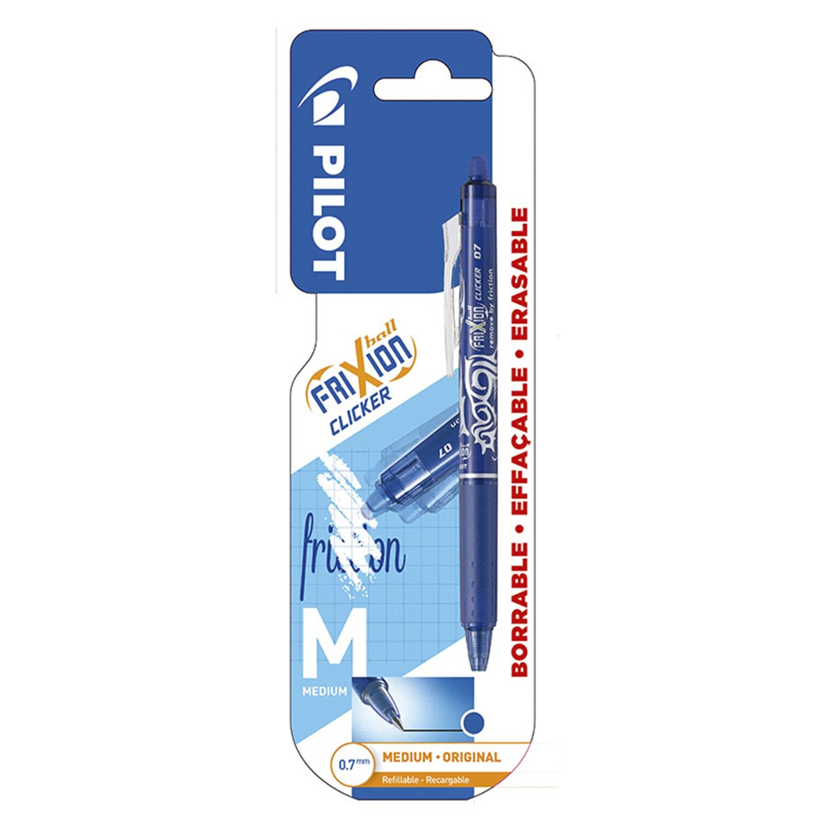 Bolígrafo retráctil, borrable y recargable Pilot FriXion Ball Clicker, con punta de bola de 0.7 mm y grip anti fatiga ergonómico en la parte inferior. Tinta líquida especial (Recargable) termosensible que se corrige con su exclusiva goma de borrar. El color del cuerpo del bolígrafo coincide con el color de la tinta.
