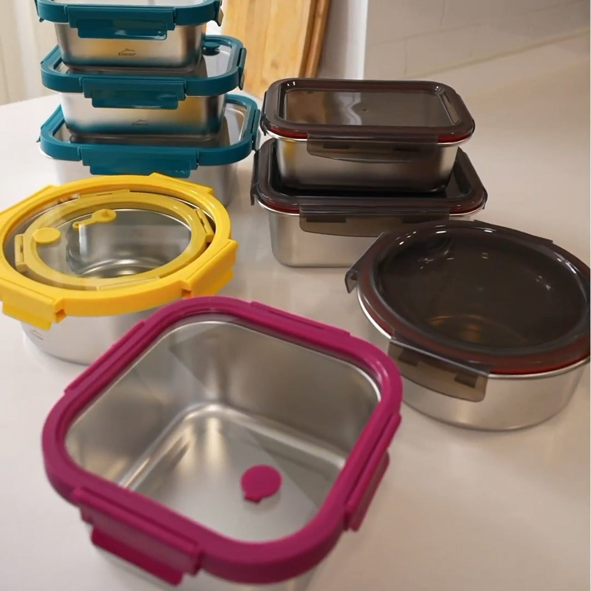 Recipientes herméticos rectangulares LACOR Etern, fabricado en acero inoxidable 18/10 con tapa de cristal y válvula de silicona. Especialmente resistente a la oxidación y las bacterias, apto para microondas con la tapa puesta. Higiénico, no transmite olores ni sabores a los alimentos. Fácilmente apilables y encajables entre sí en algunos formatos, ahorran espacio en tu cocina.