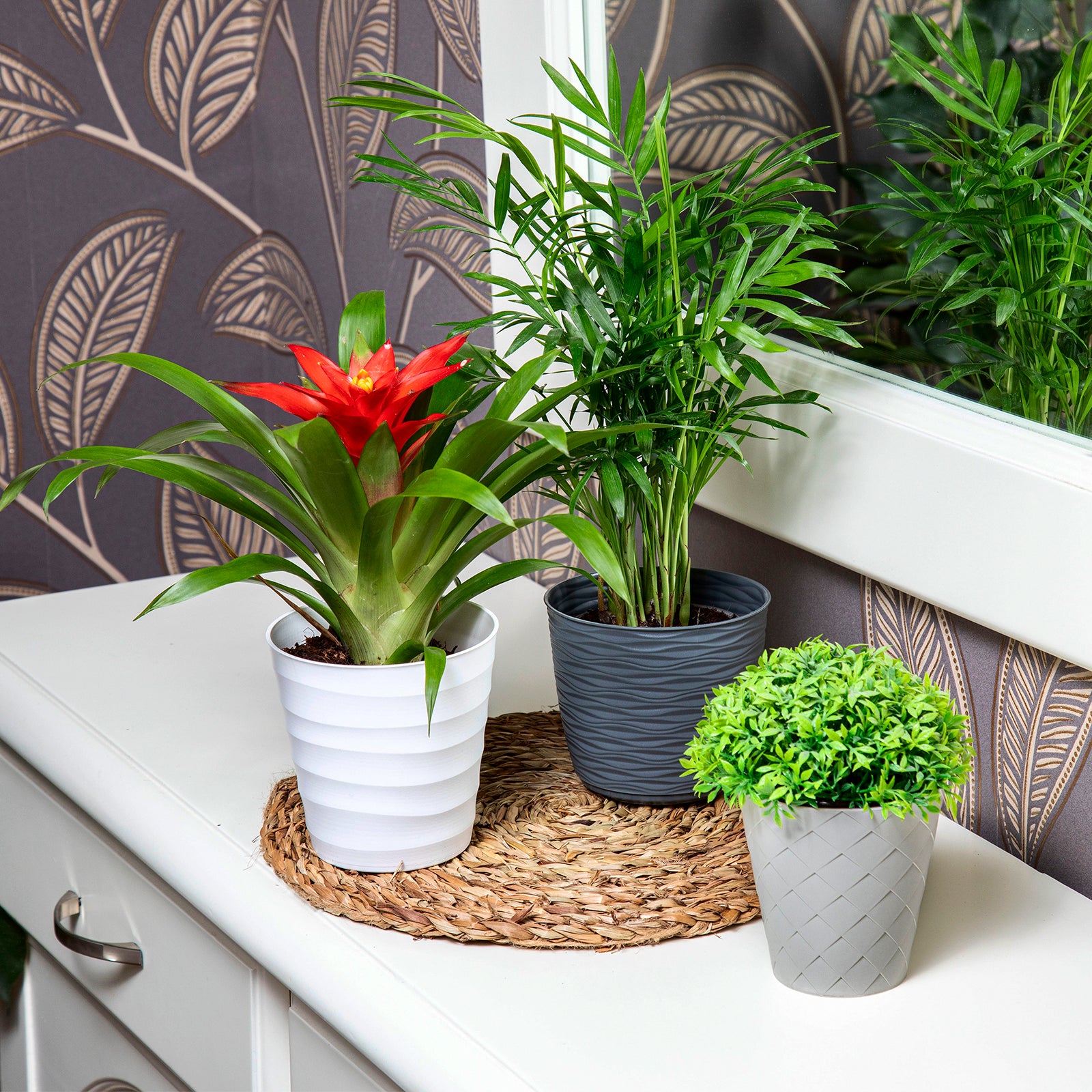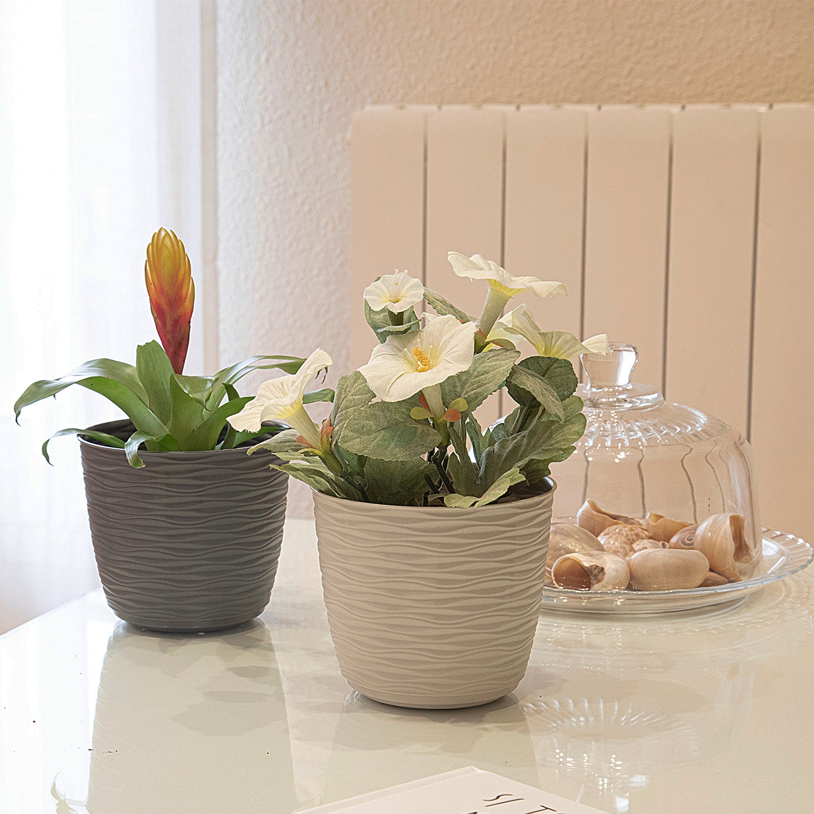 Maceta decorativa redonda de la nueva gama Areca Wind con acabado texturizado apta para interior o exterior. Fabricada en plástico muy resistente PP05 100% reciclado y reutilizable. Además, cuenta con agujeros de drenaje en la base y plato integrado, que hace el diseño más estético a la vez que mantiene la planta hidratada en todo momento.