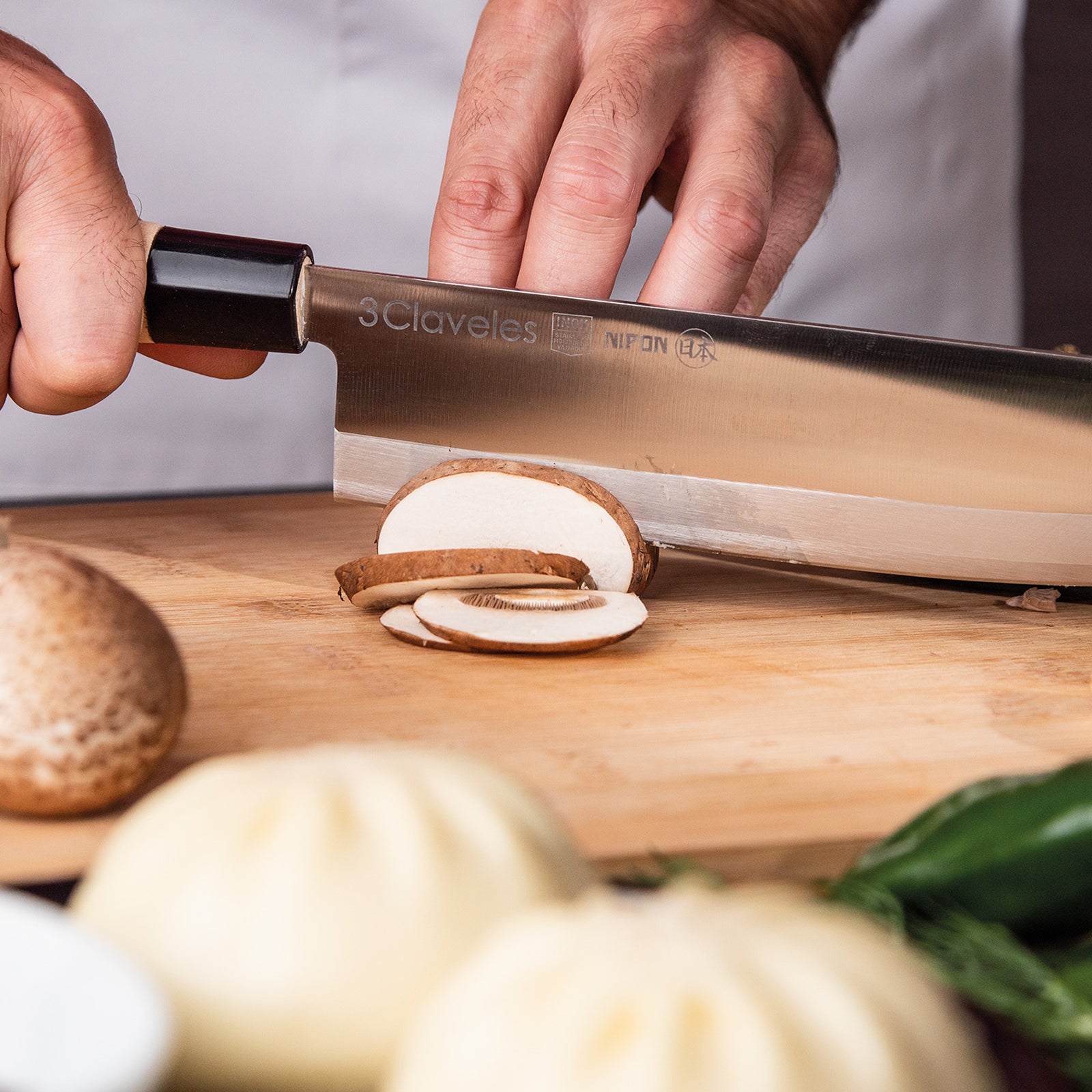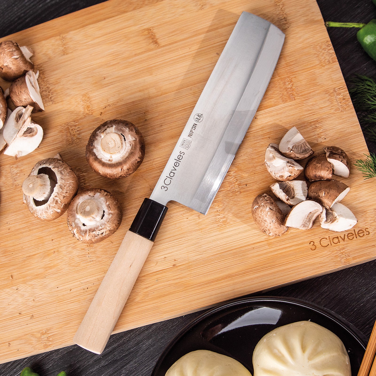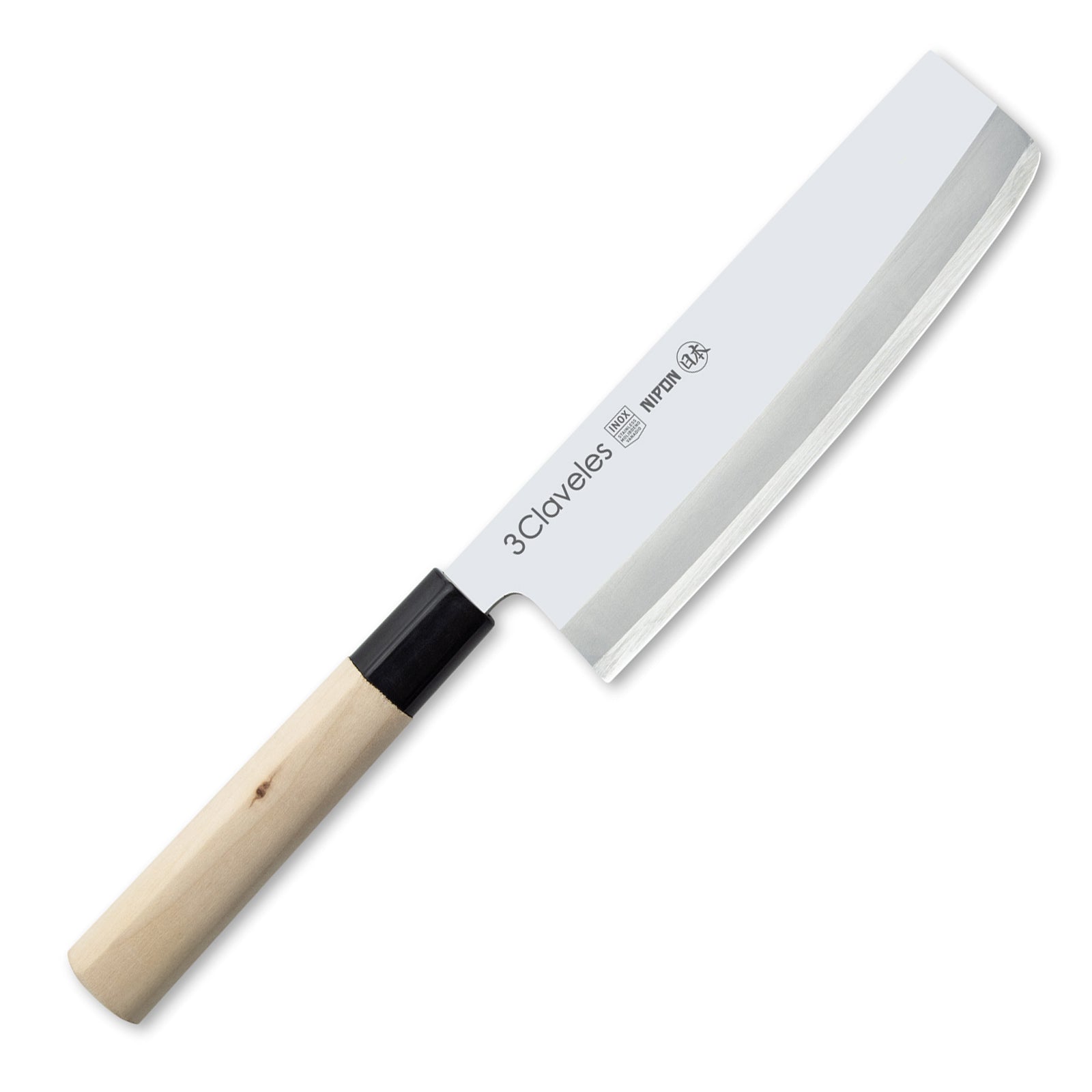 Cuchillo profesional Usuba de 180 mm de la gama 3 Claveles NIPON de estilo japonés, donde predominan las líneas rectas en la forma del mango, pensado para el uso diario sin renunciar al diseño. Diseñado para cortar verduras, con hoja de corte recto para una correcta separación en la tabla de corte. Las rodajas finas no son ningún problema para este tipo de cuchillo ya que posee una hoja ancha para un buen guiado. Especial para realizar cortes precisos y profundos por el filo en un solo lado al estilo tradicional de la cocina asiatica.