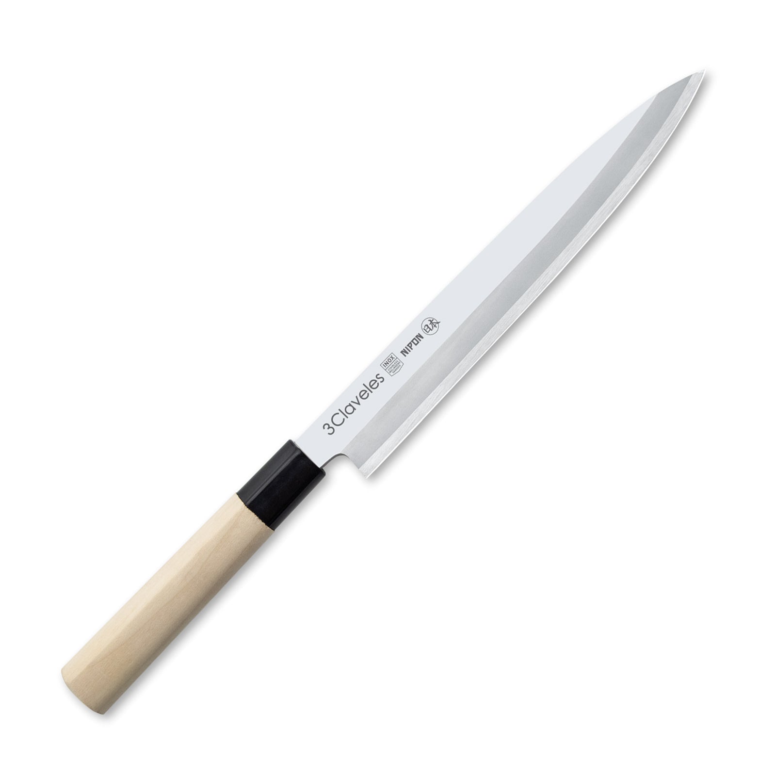 Cuchillo profesional Yanagiba de 240 mm de la gama 3 Claveles NIPON de estilo japonés, donde predominan las líneas rectas en la forma del mango, pensado para el uso diario sin renunciar al diseño. Diseñado para cortar al tamaño deseado y filetear pescado o carne en el movimiento de vuelta. Hoja delgada en forma de sauce o Katana. Es el cuchillo que se utiliza tal y como su nombre indica para cortar sashimi y también para sushi. Especial para realizar cortes precisos y profundos por el filo en un solo lado al estilo tradicional de la cocina asiatica.