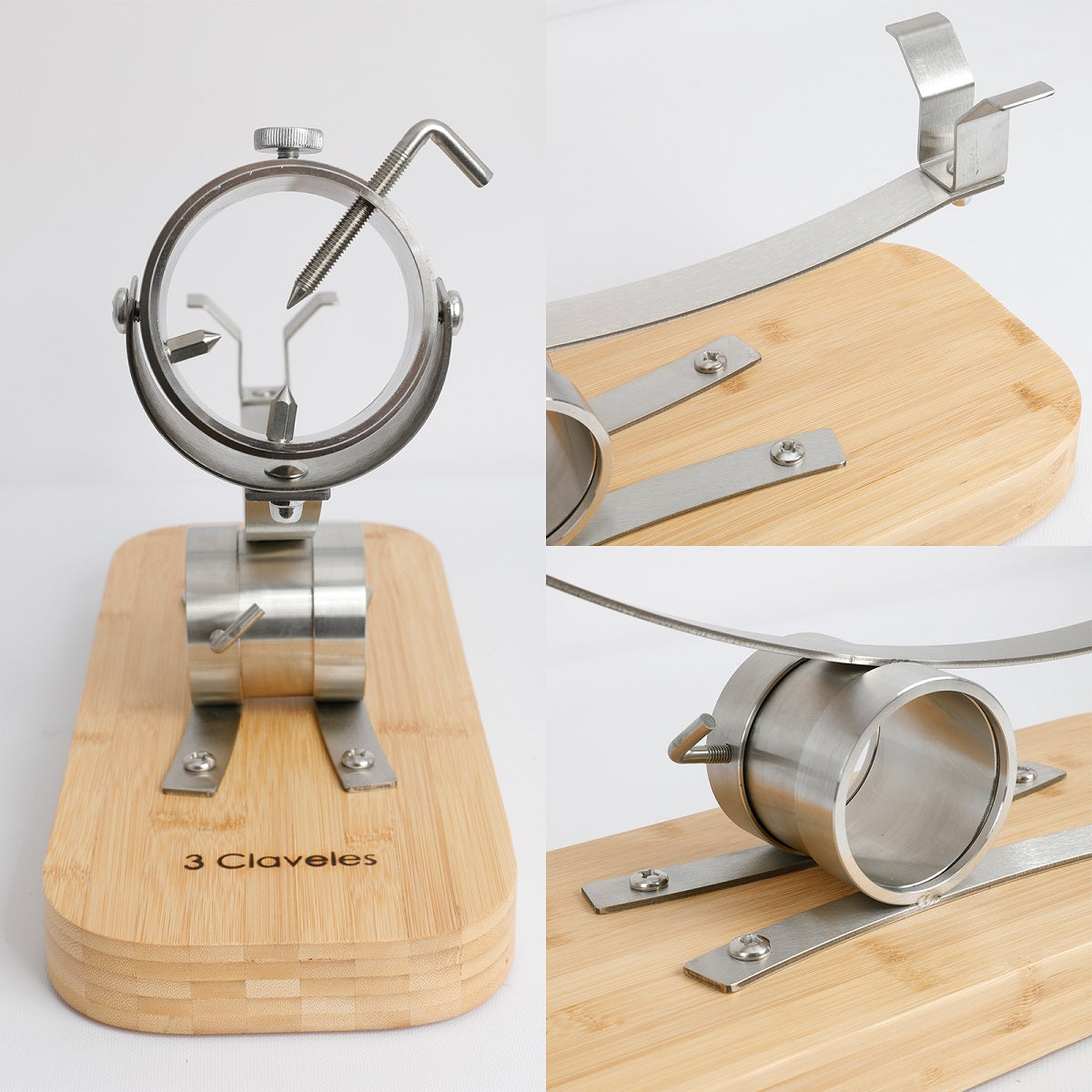 Soporte jamonero basculante con cabezal giratorio 3 Claveles fabricado en acero cromado y madera de bambú. Su forma y diseño facilitan el corte del jamón en cualquier ángulo. El soporte es de madera de bambú y los herrajes y pinchos son de acero cromado. Corte cómodo y ergonómico para el usuario. Diseño basculante exclusivo de 3 Claveles.