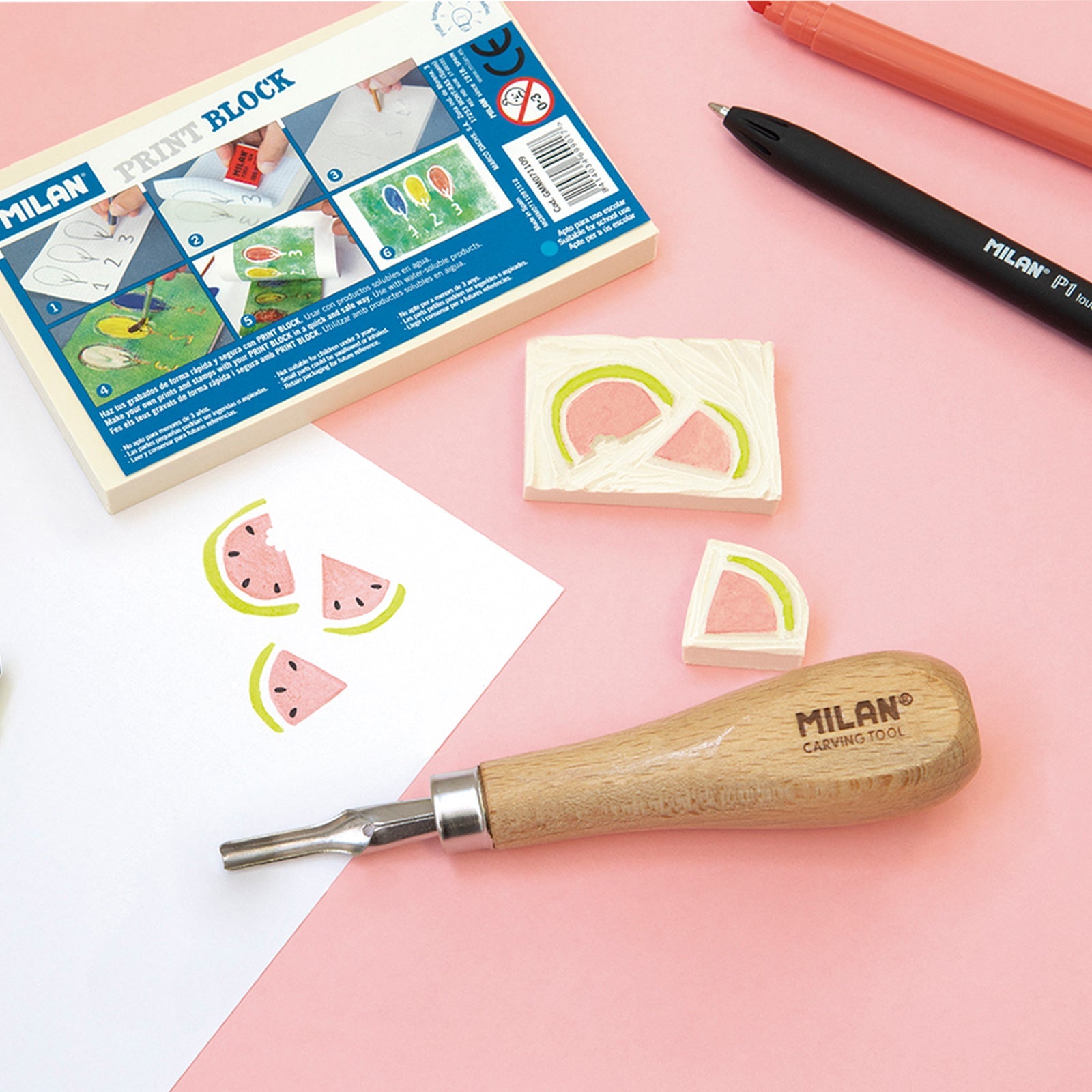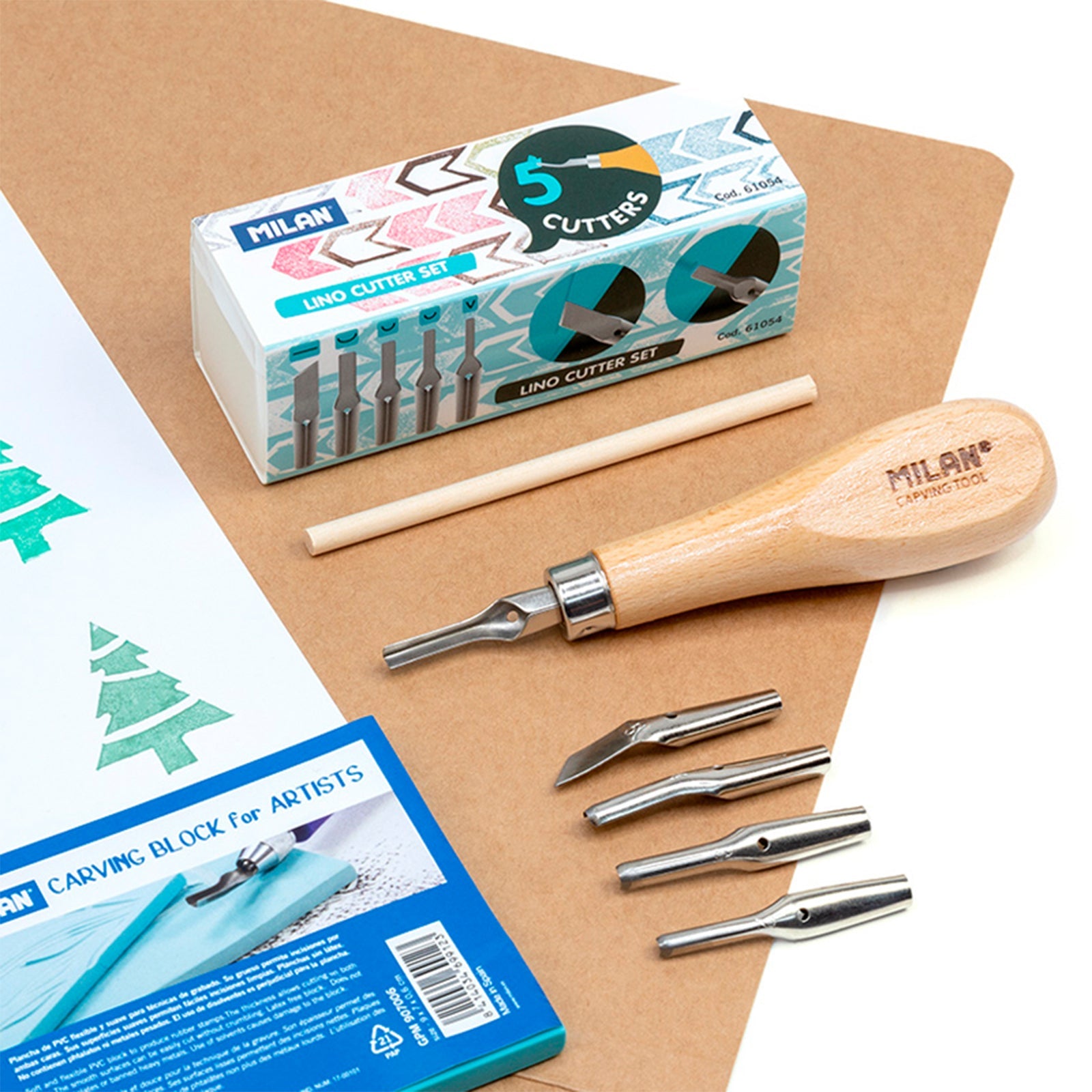 Set de gubias con mango de madera y cinco puntas de gubia de distintos tamaños. Perfecta para tallar o cavar planchas de linóleo o planchas de goma de alta densidad. Es genial para cavar sellos. Contiene caja de plástico para guardarla Referencia: 61054