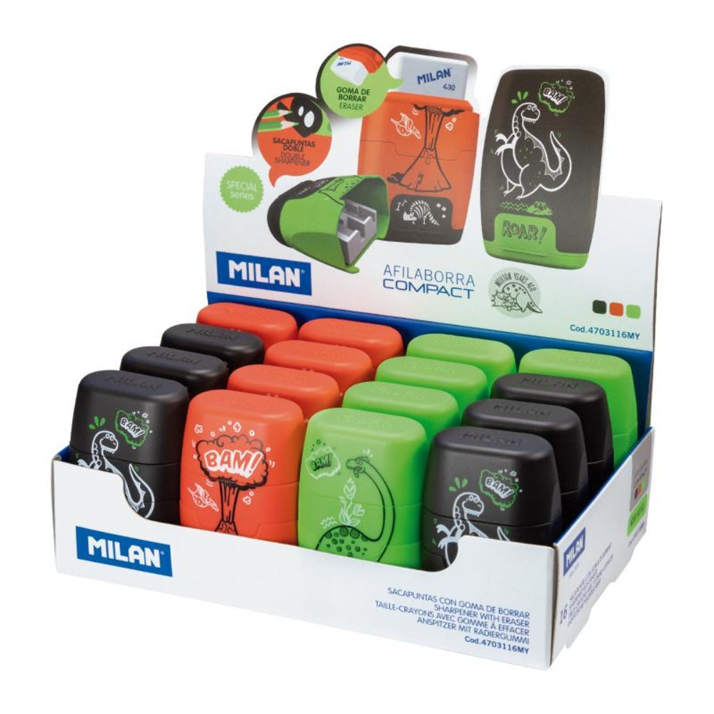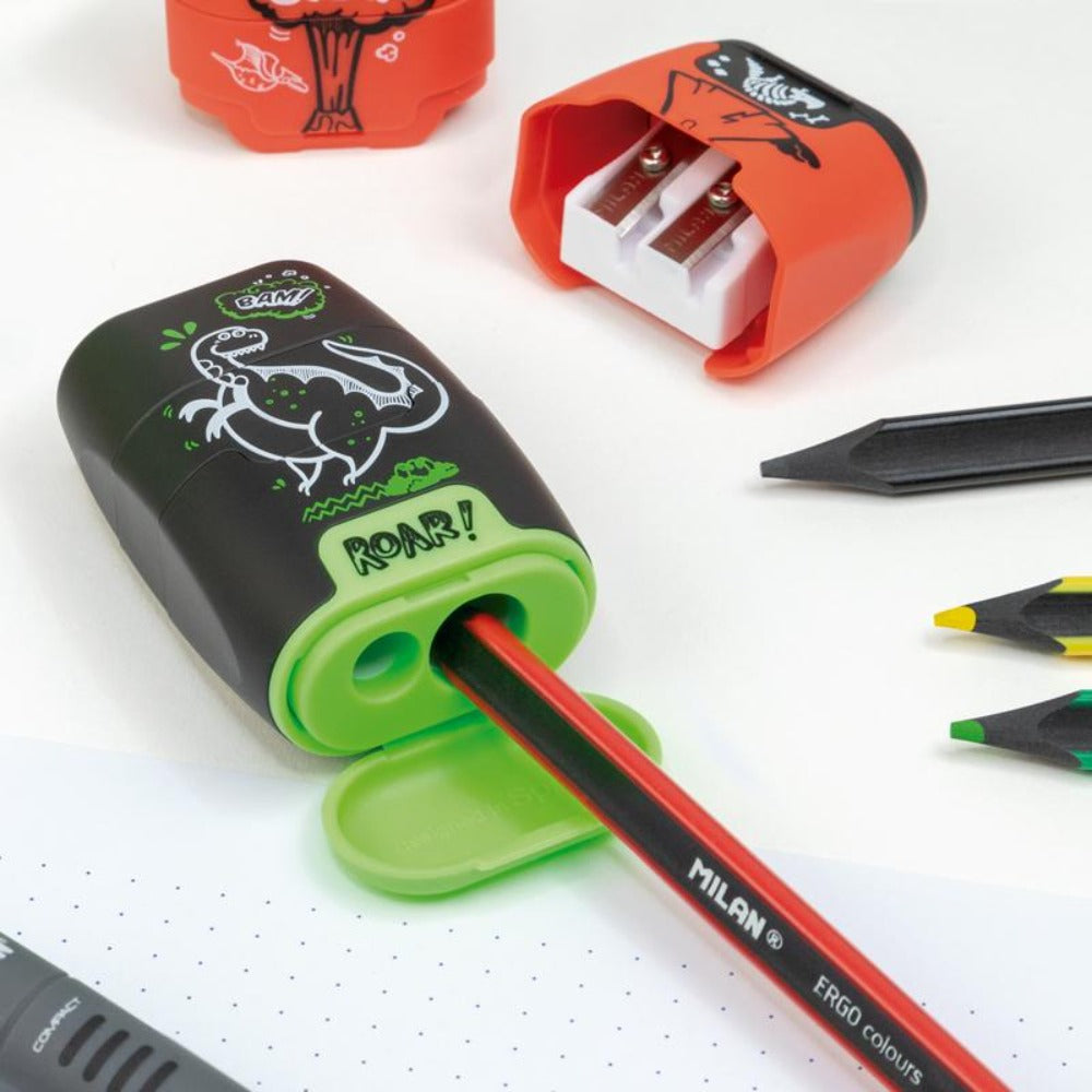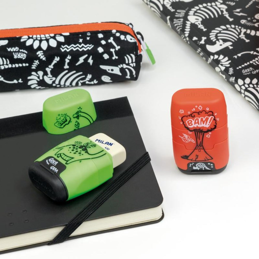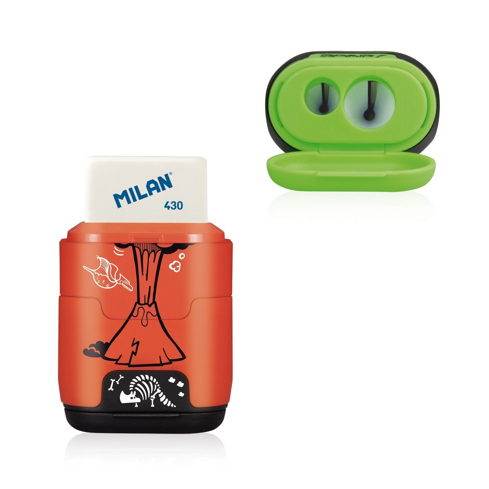 Afilaborra con 4 gomas de recambio Milan COMPACT Million Years Ago, una combinación de goma y sacapuntas doble (uno estándar y otro MAXI). La goma cuadrada es suave de caucho sintético tipo "miga de pan". El sacapuntas tiene una cuchilla de acero al carbono afilada y resistente, ideal para todo tipo de lápices.