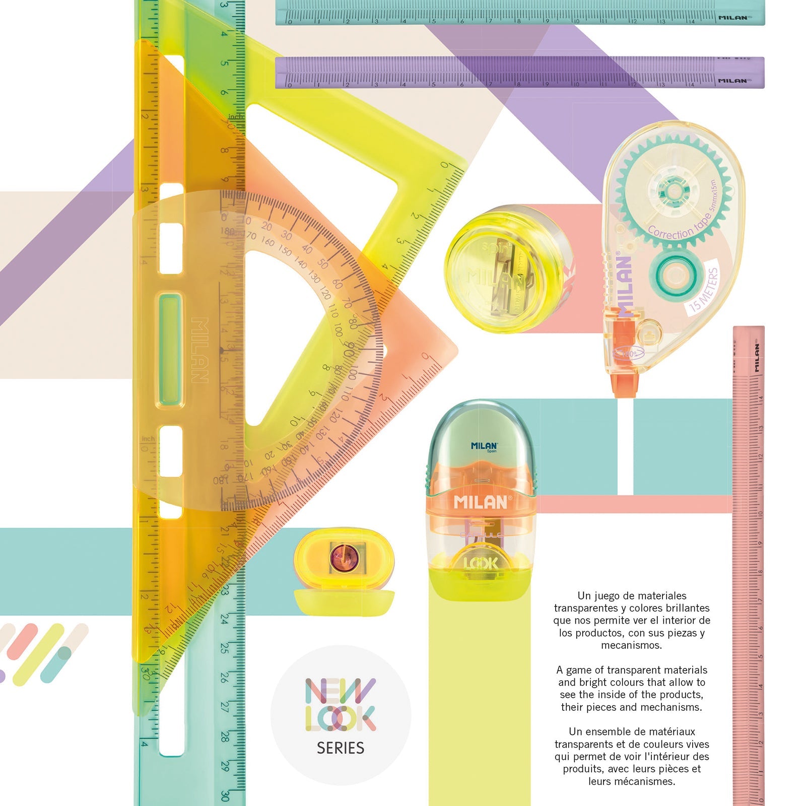 Pack de 4 reglas triangulares de 15 cm de la serie New Look de MILAN. Están fabricadas en plástico rígido transparente. Colores translúcidos disponibles: amarillo, naranja, verde y lila.