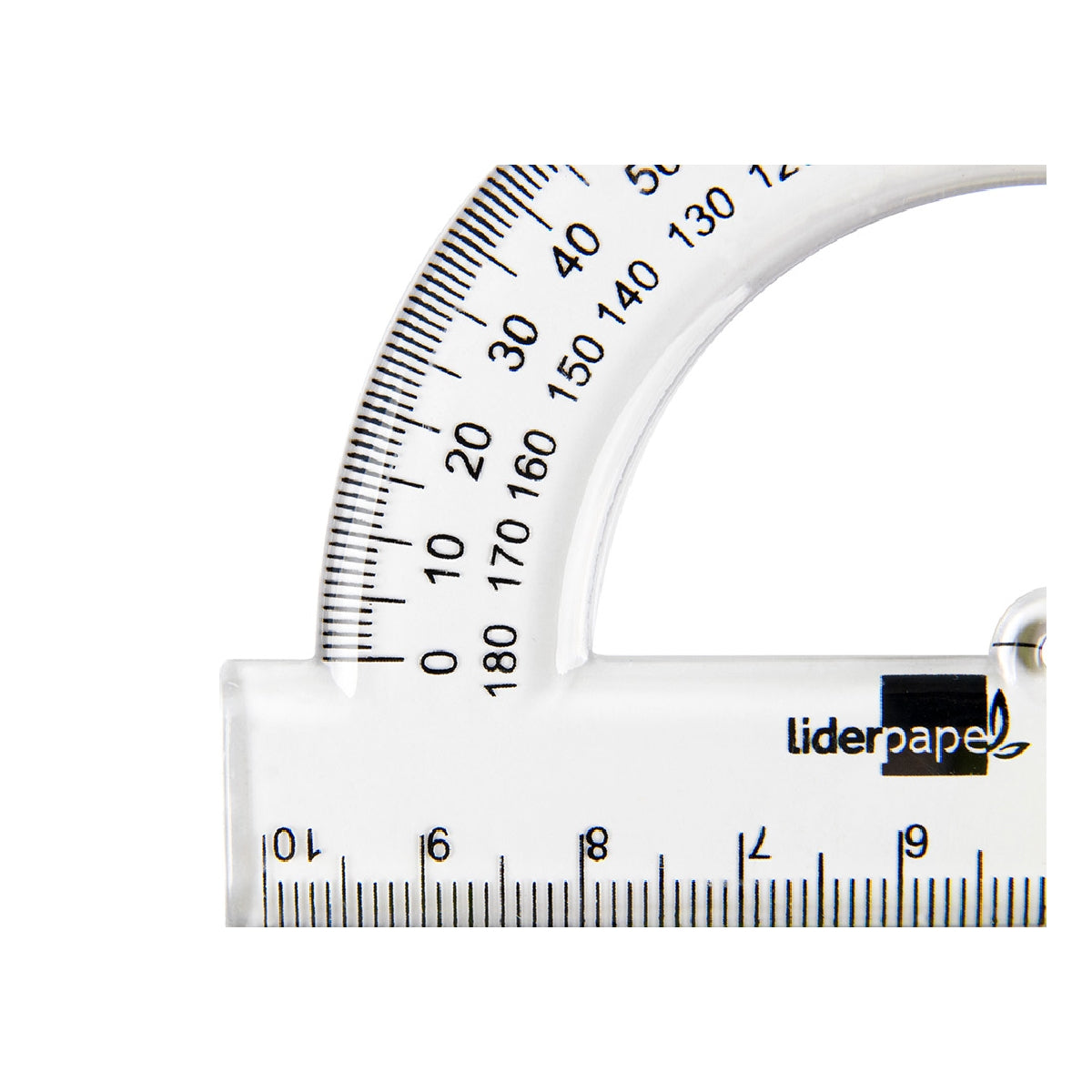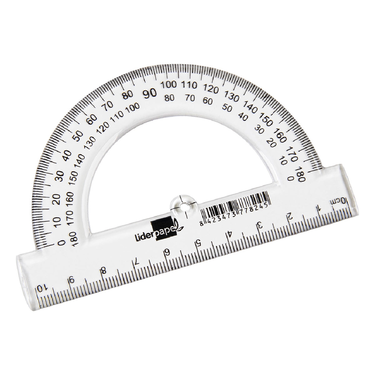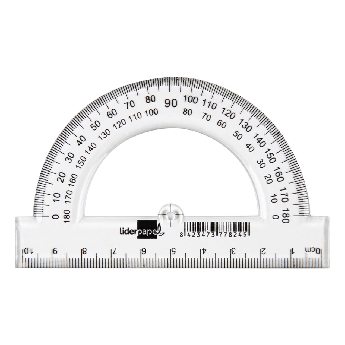 Transportador de ángulos de plástico transparente. Contiene 2 escalas opuestas de 0° a 180°. Base de 100 mm.