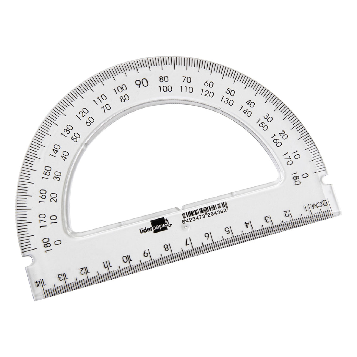 Transportador de ángulos de plástico transparente. Contiene 2 escalas opuestas de 0° a 180°. Base de 140 mm.