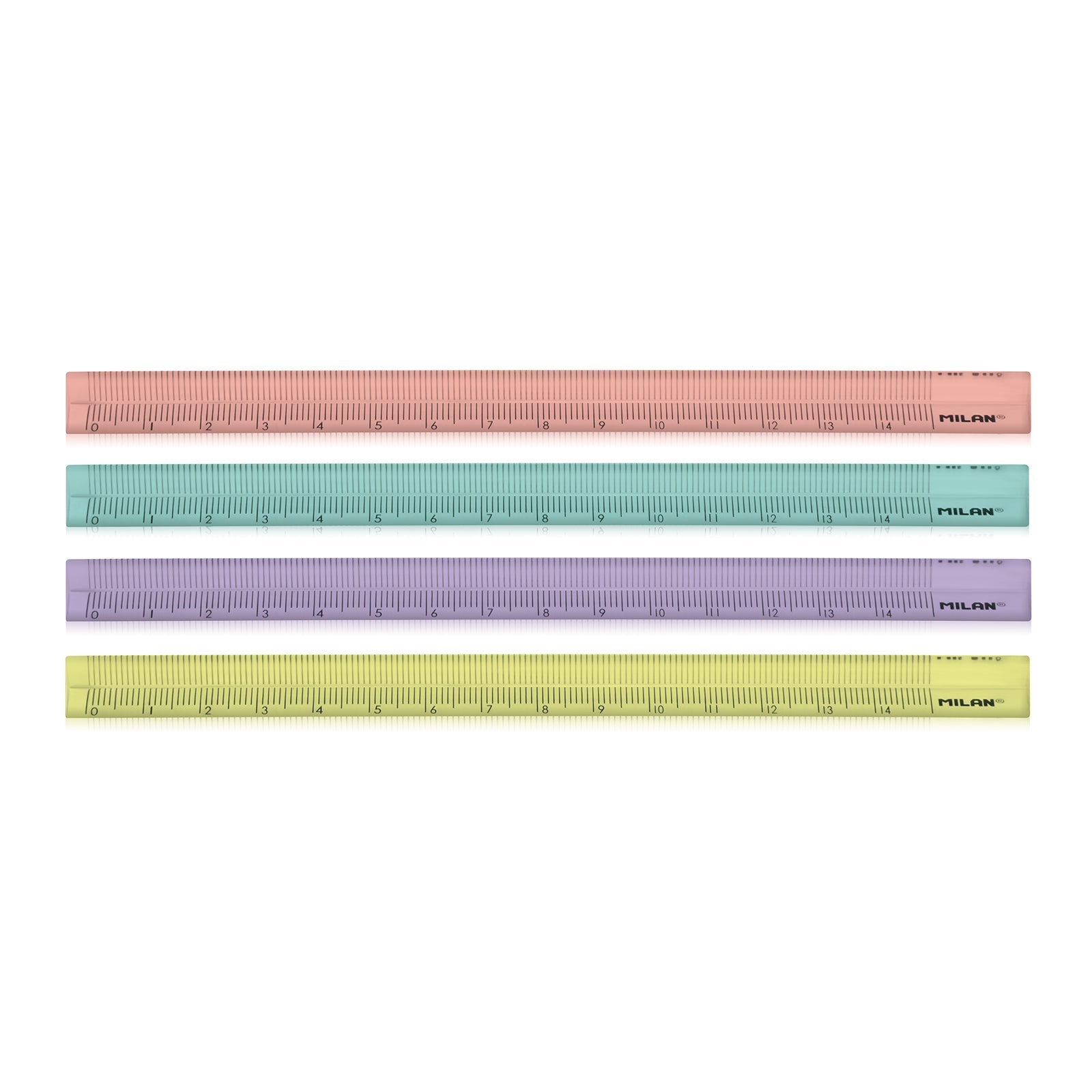 Caja con 60 reglas triangulares de 15 cm de la serie New Look de MILAN. Están fabricadas en plástico rígido transparente. Colores translúcidos disponibles: amarillo, naranja, verde y lila. 15 Unidades de cada color