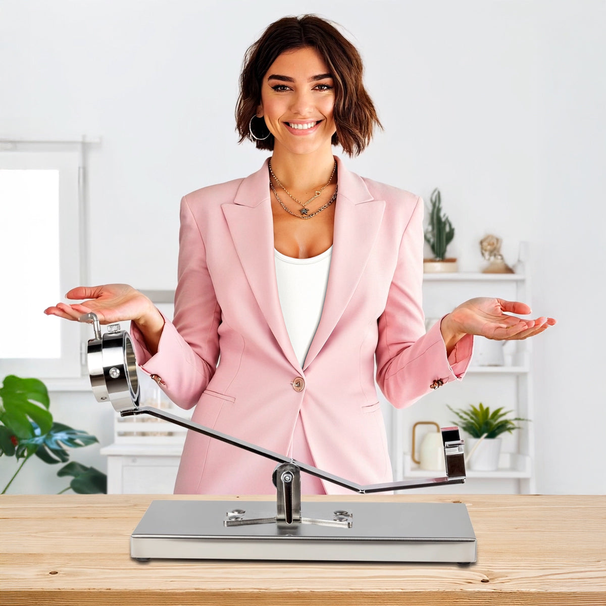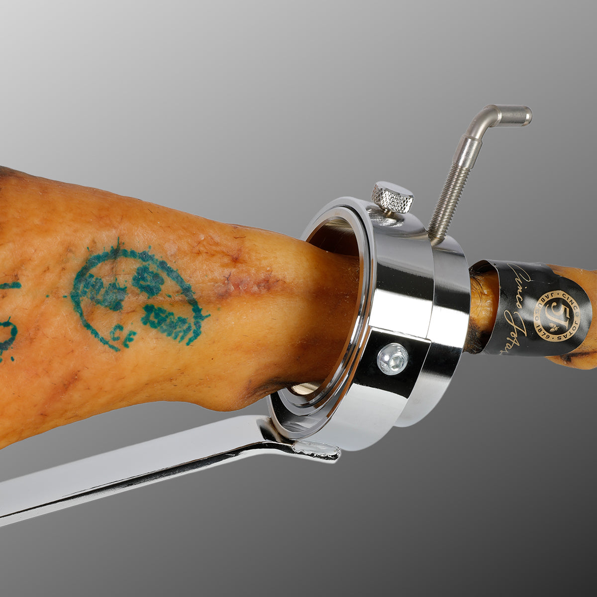 Su sistema de casquillos giratorios permiten girar el jamón los grados que se desee sin necesidad de soltar la pata. La sujeción de la punta tiene forma de V y no lleva pincho para evitar perforar el jamón y/o dañarlo. Es un jamonero muy versátil, manejable y cómodo de usar y limpiar.