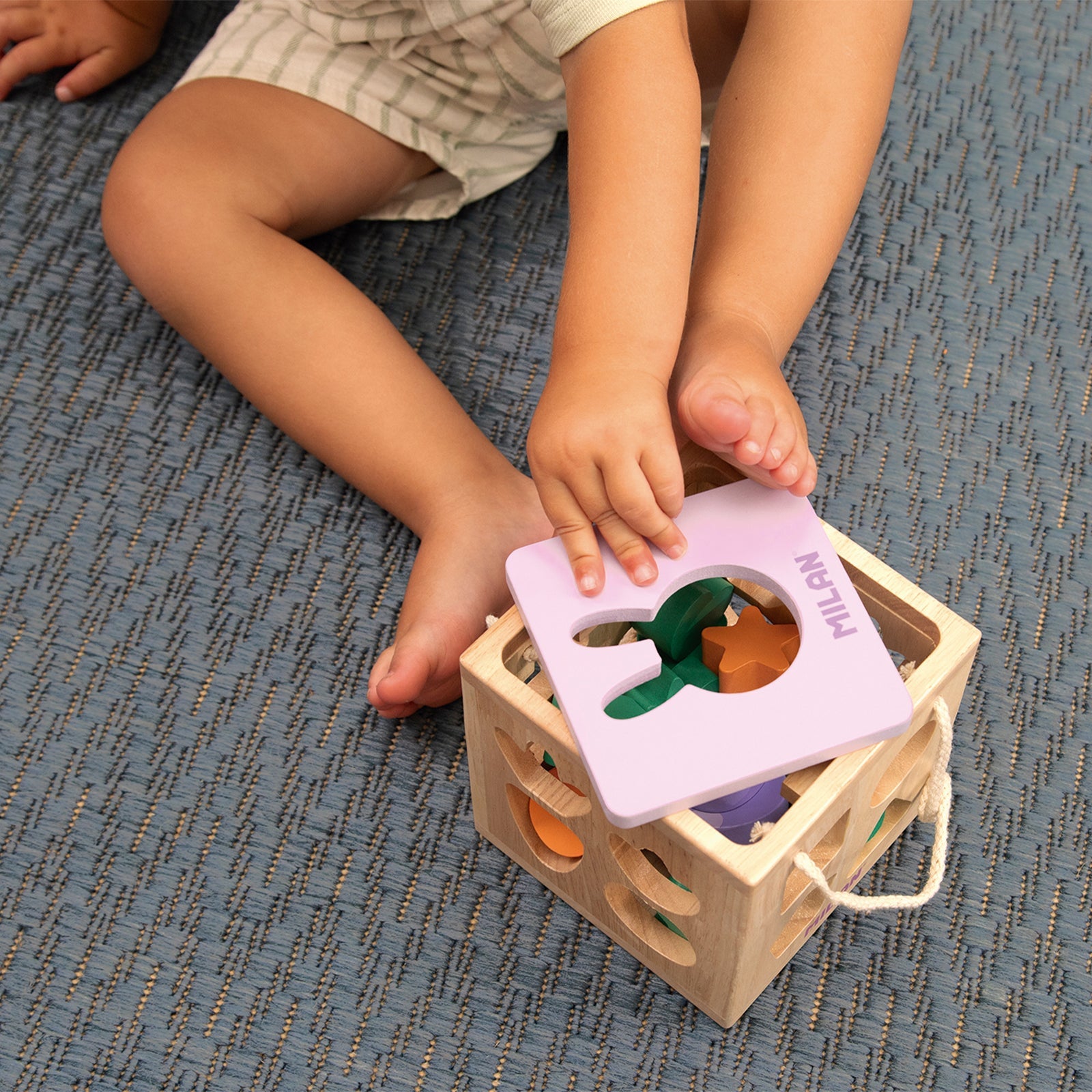 Juguete educativo de madera, denominado Rabbit de MILAN que contiene 17 piezas y un cubo con tapa para poder extraer las piezas una vez depositadas en su interior. Formas geométricas y redondeadas, siendo el conejito el protagonista del juego.