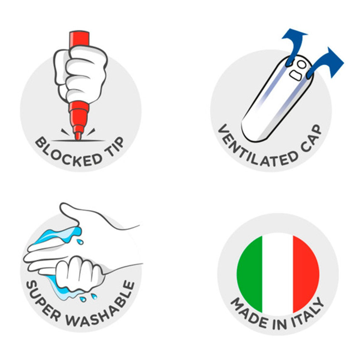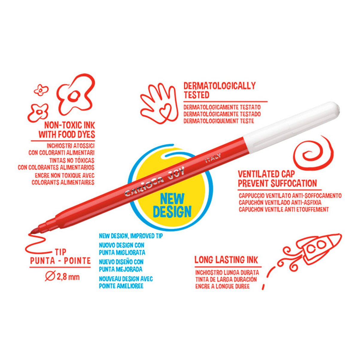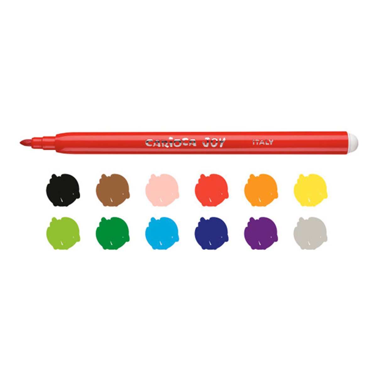 Cada de 12 rotuladores de colores. Punta de nylon de 2.6 mm de diámetro. Tinta a base de agua y colorantes alimentarios inocuos y lavables. Punta bloqueada. Permite hasta 800 m de escritura. Sin gluten. Estuche de cartón.