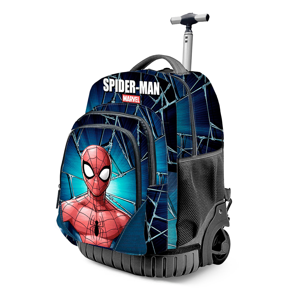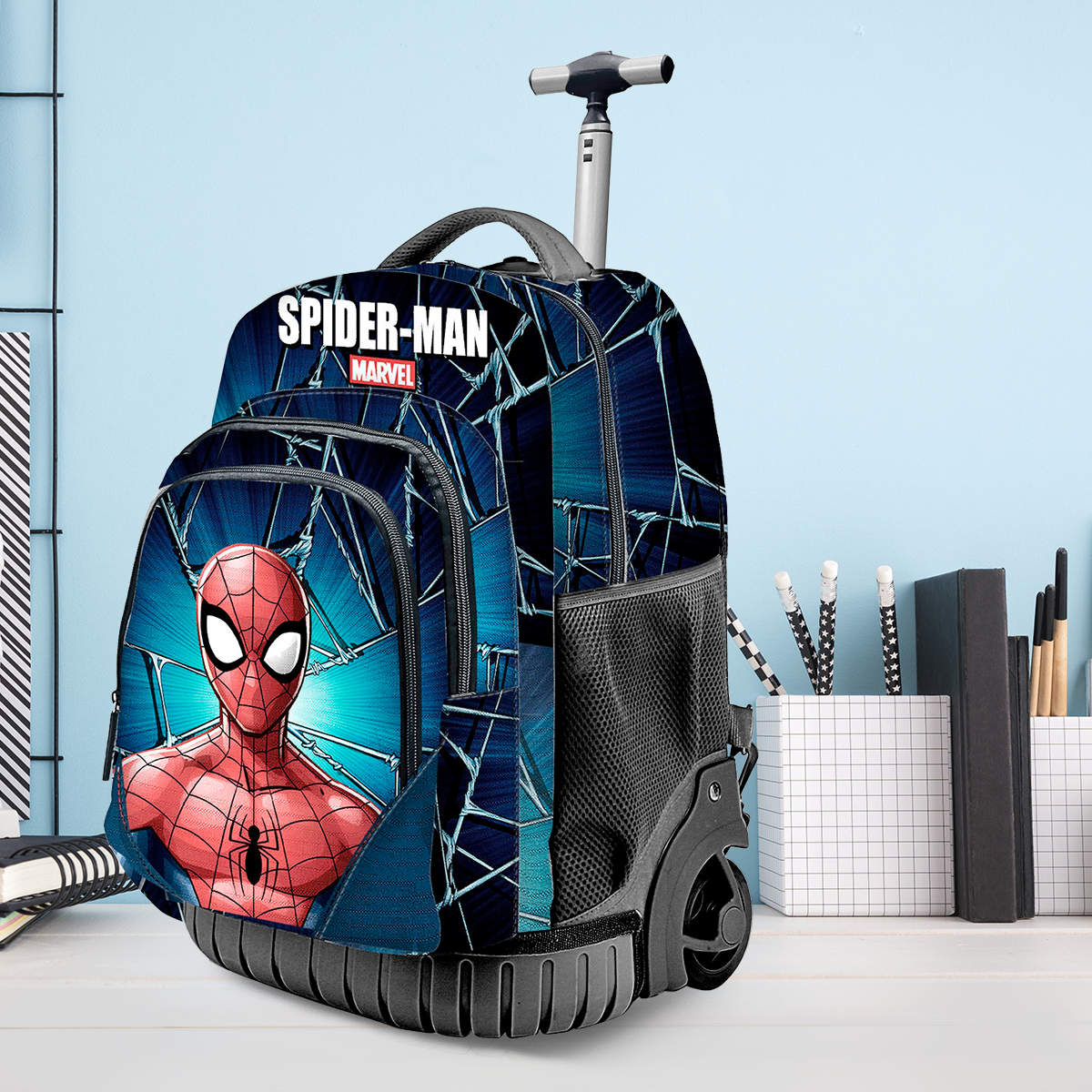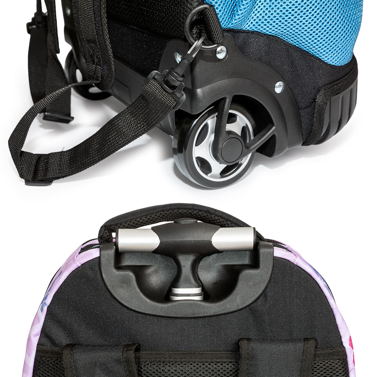 Mochila escolar con 2 ruedas integradas. Dos compartimentos, un bolsillo frontal y dos bolsillos laterales de red. Interior con forro y bolsillo acolchado para dispositivos electrónicos. Correas al hombro para llevar como mochila.