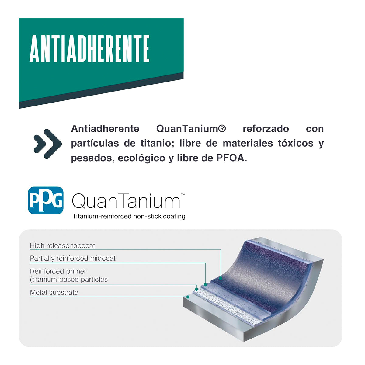 Con Antiadherente QuanTanium® reforzado con partículas de titanio, la resistencia y durabilidad del mismo es muy superior a otros antiadherentes que pueden encontrarse en el mercado. Totalamente libre de tóxicos, materiales pesados y sin PFOA.