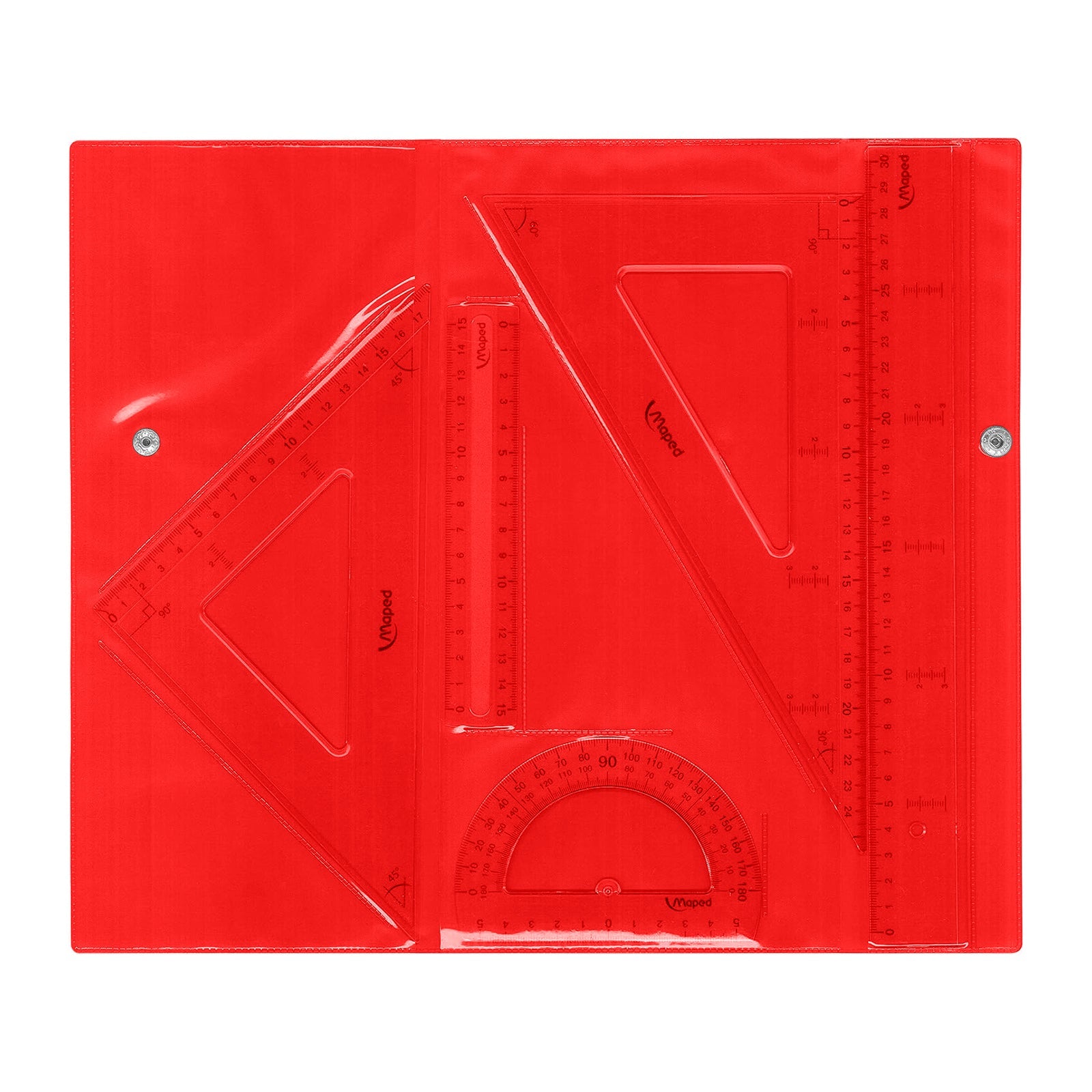Incluye un regla de 30 cm y una de 15cm, un cartabón de 60º, una escuadra de 45º y un transportador de ángulos de 180º.