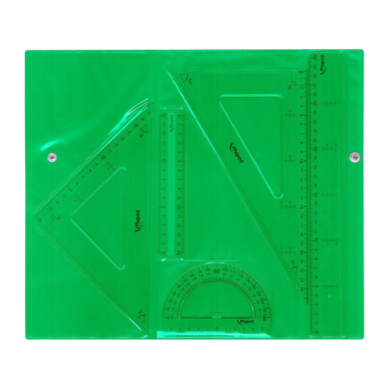 Incluye un regla de 30 cm y una de 15cm, un cartabón de 60º, una escuadra de 45º y un transportador de ángulos de 180º.