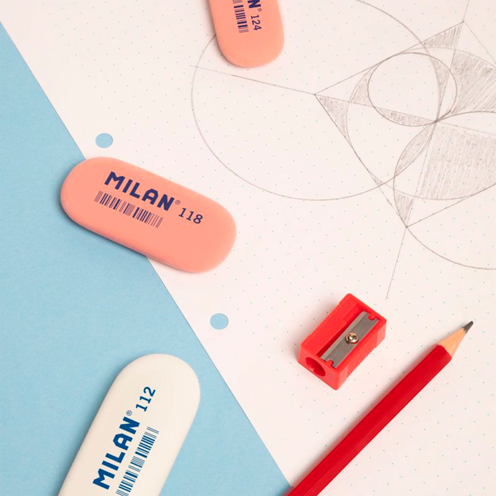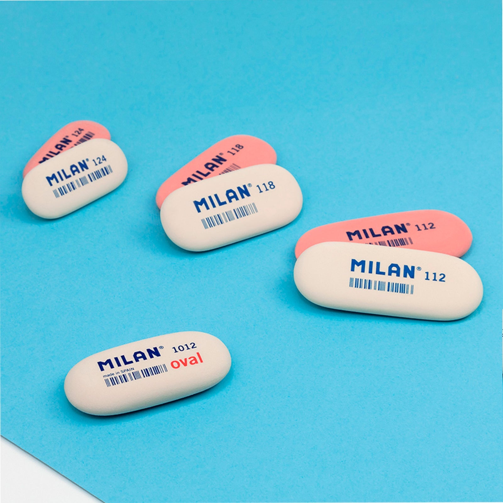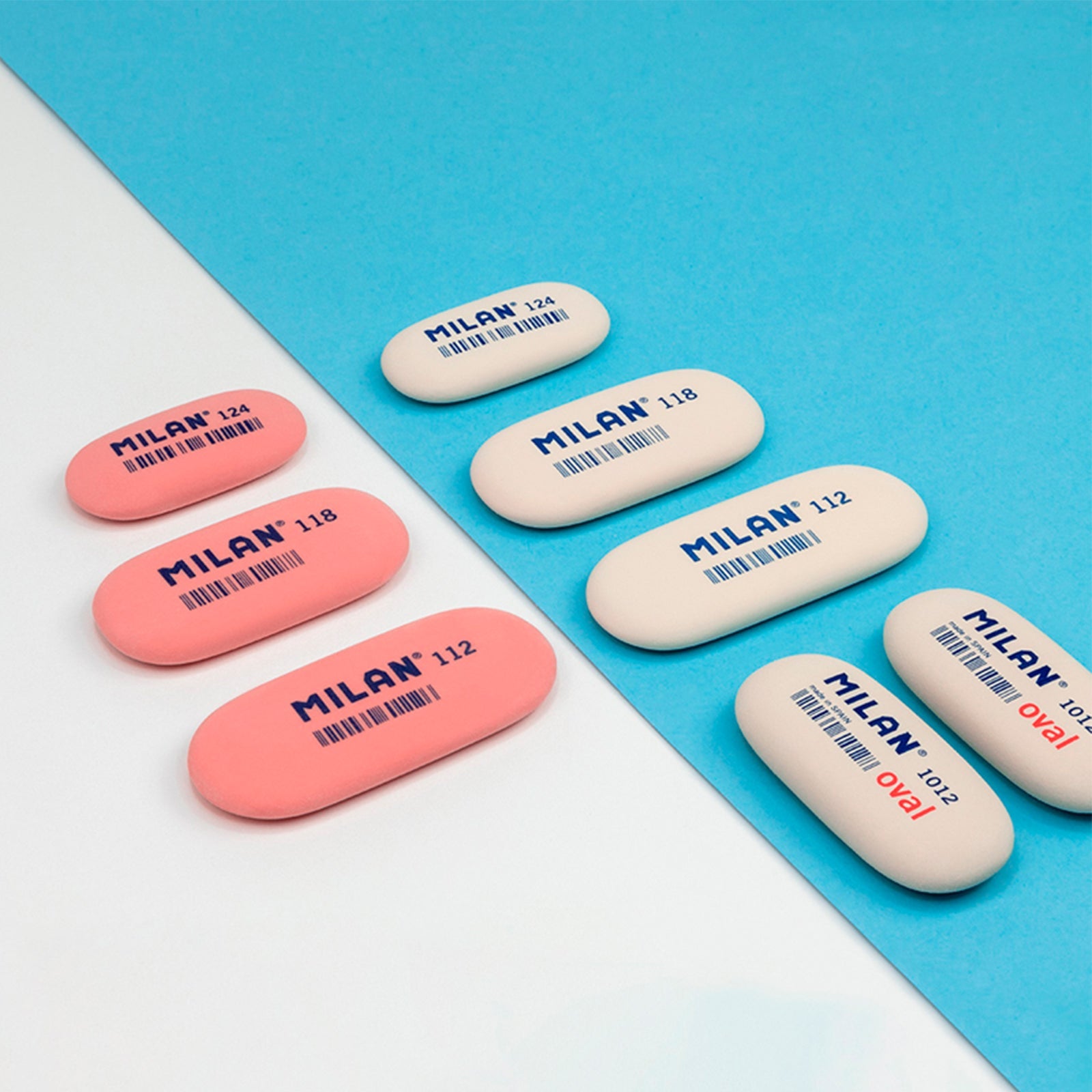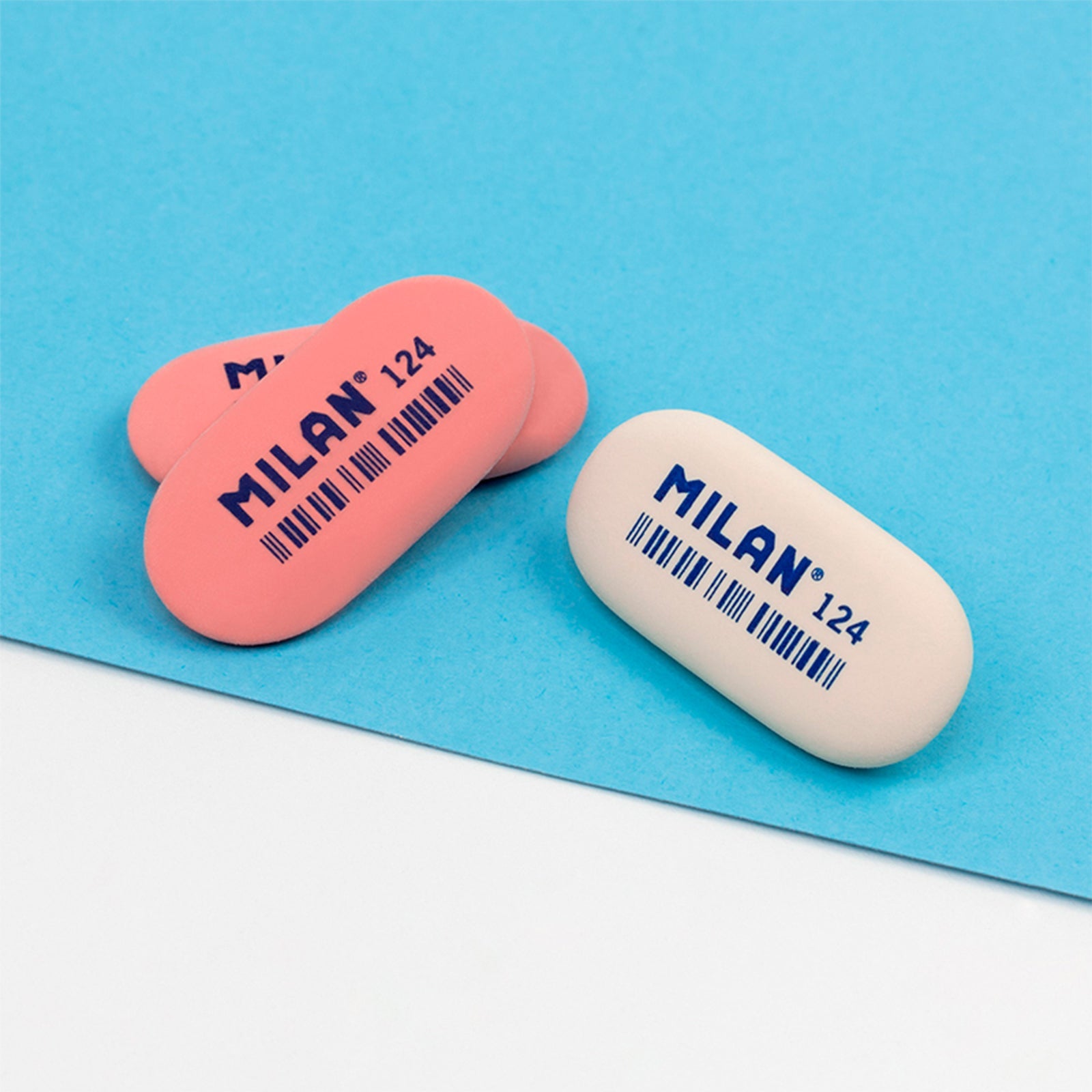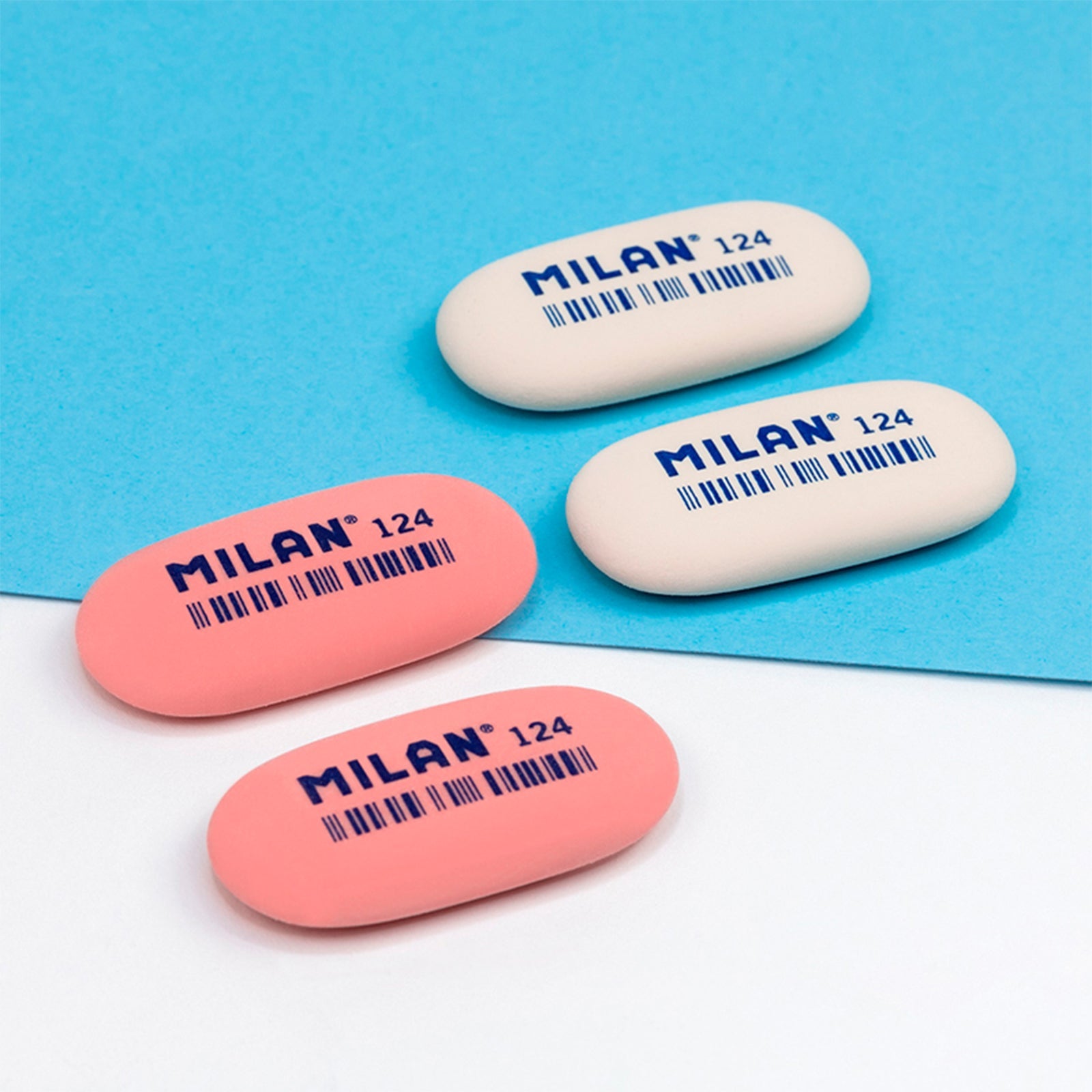 Caja de 24 gomas de Borrar Miga de Pan Oval 124. Goma suave de caucho sintético tipo miga de pan ovalada. Para borrar una amplia gama de lápices de grafito sobre toda clase de papeles. Colores surtidos: blanco y rosa. Medidas goma: 4,9 x 2,3 x 0,9 cm. Las gomas de borrar Milan están fabricadas en España desde 1918.