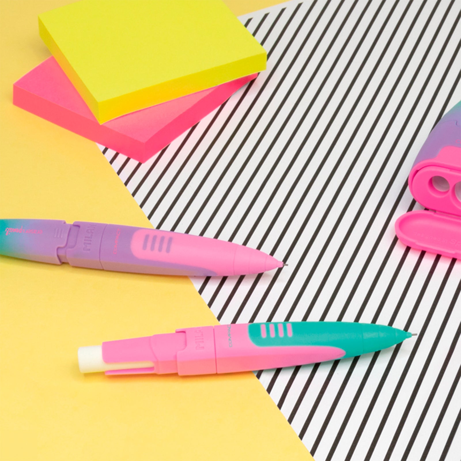 Disponible en 4 colores surtidos: amarillo, lila, rosa y verde. Diseño original creado por el departamento de I+D de MILAN. Gomas y minas de recambio disponibles.