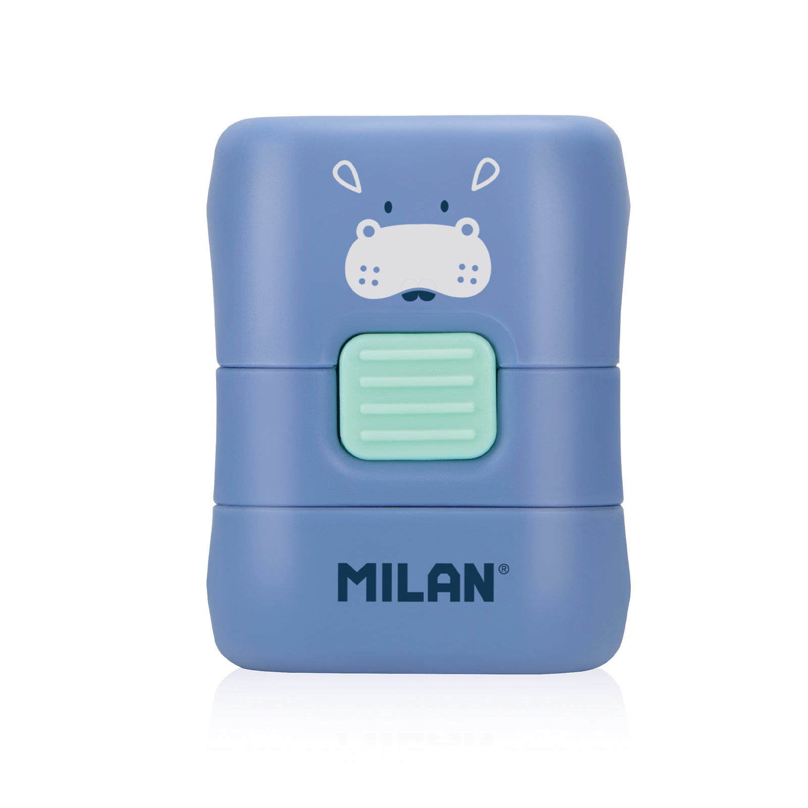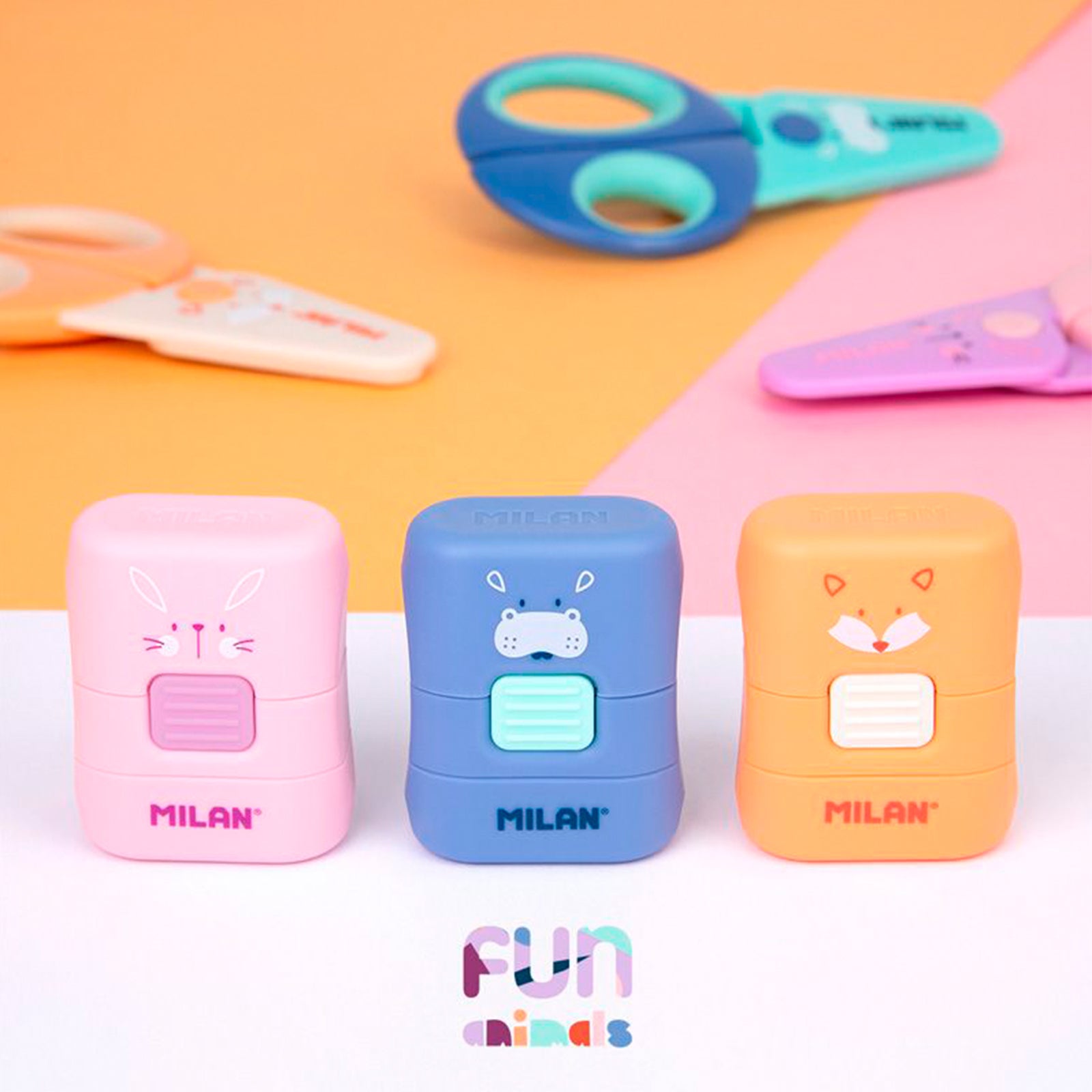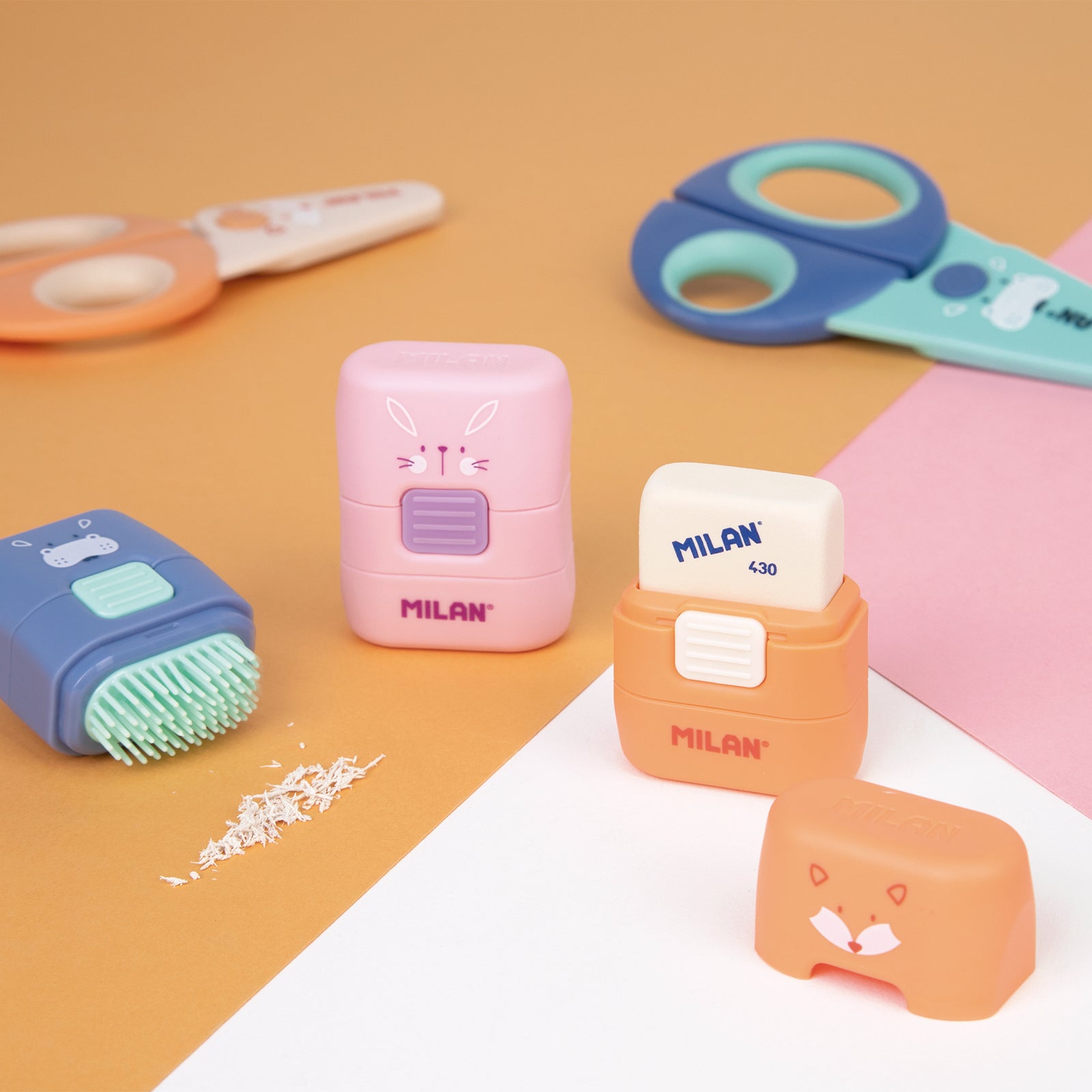 Caja Expositora de combinación de goma de borrar y cepillo MILAN, diseño Compact de la serie Fun Animals. El cepillo es flexible y permite limpiar las virutas tras el borrado.