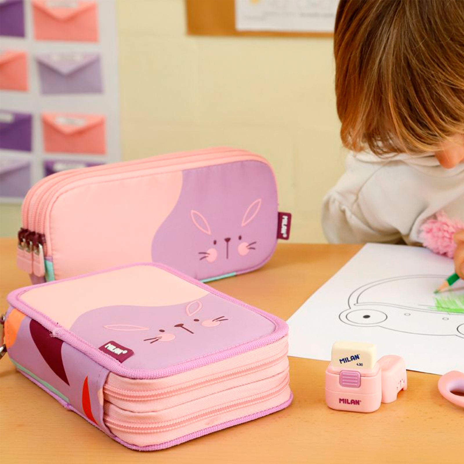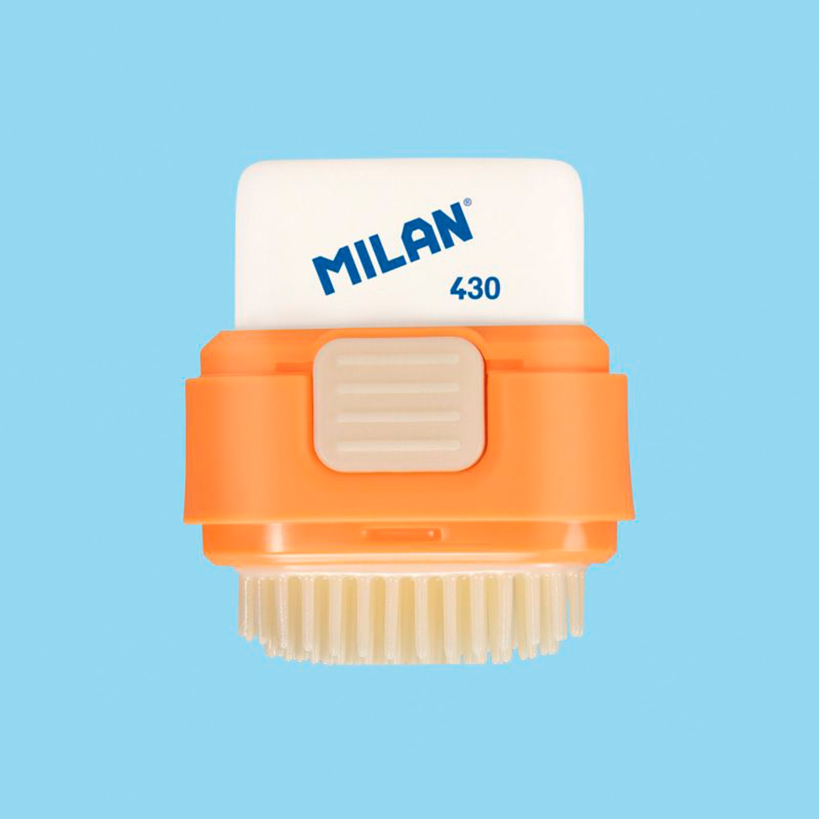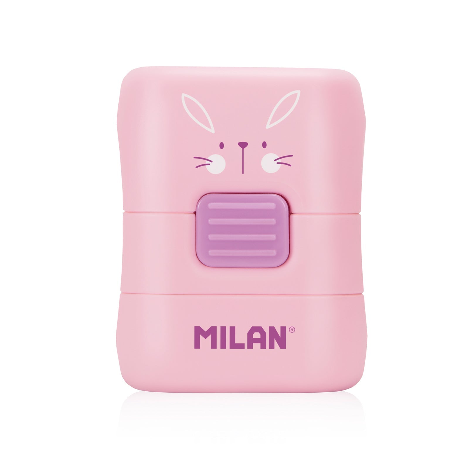 Caja Expositora de combinación de goma de borrar y cepillo MILAN, diseño Compact de la serie Fun Animals. El cepillo es flexible y permite limpiar las virutas tras el borrado.