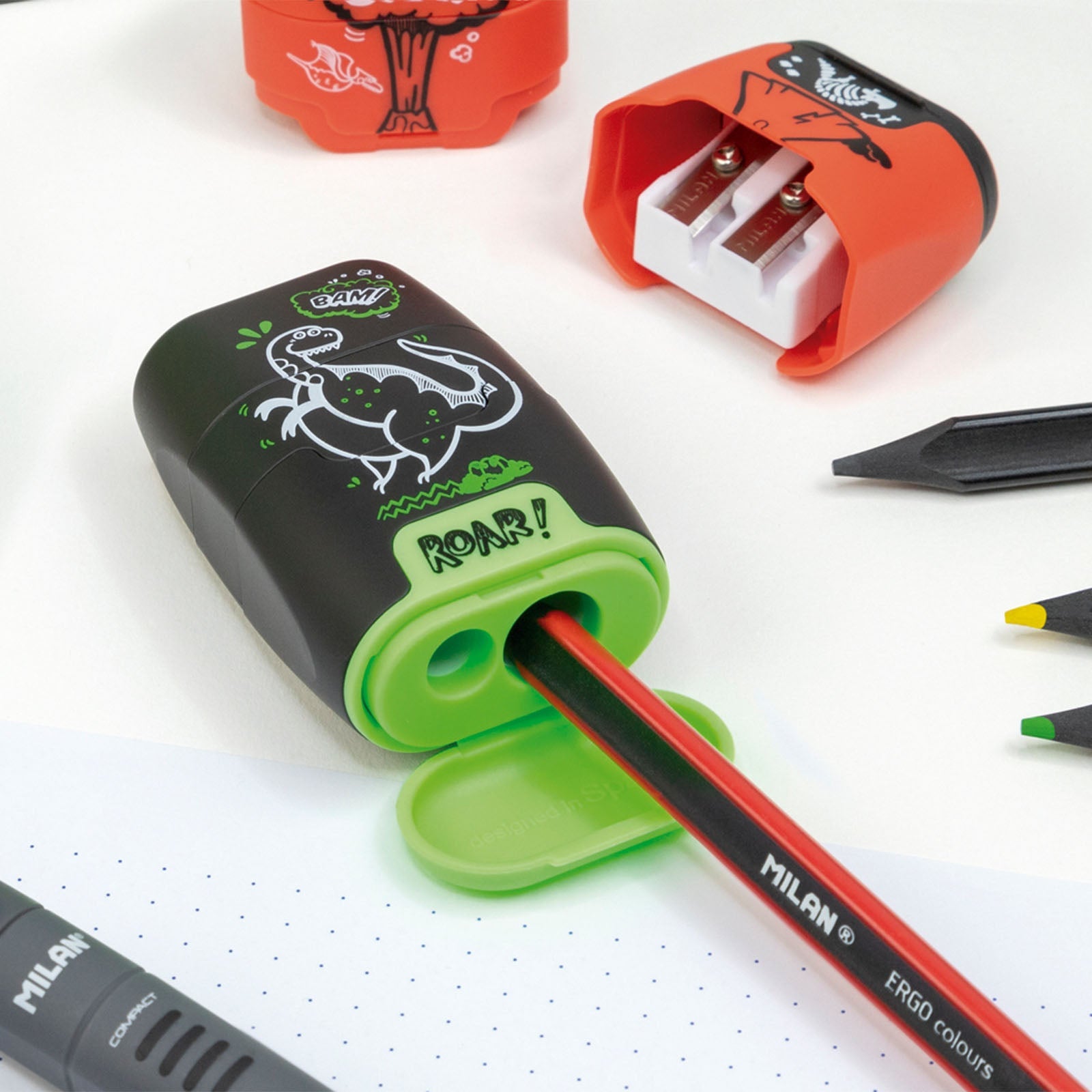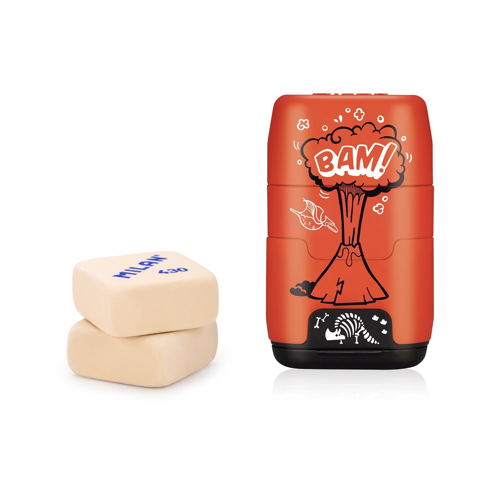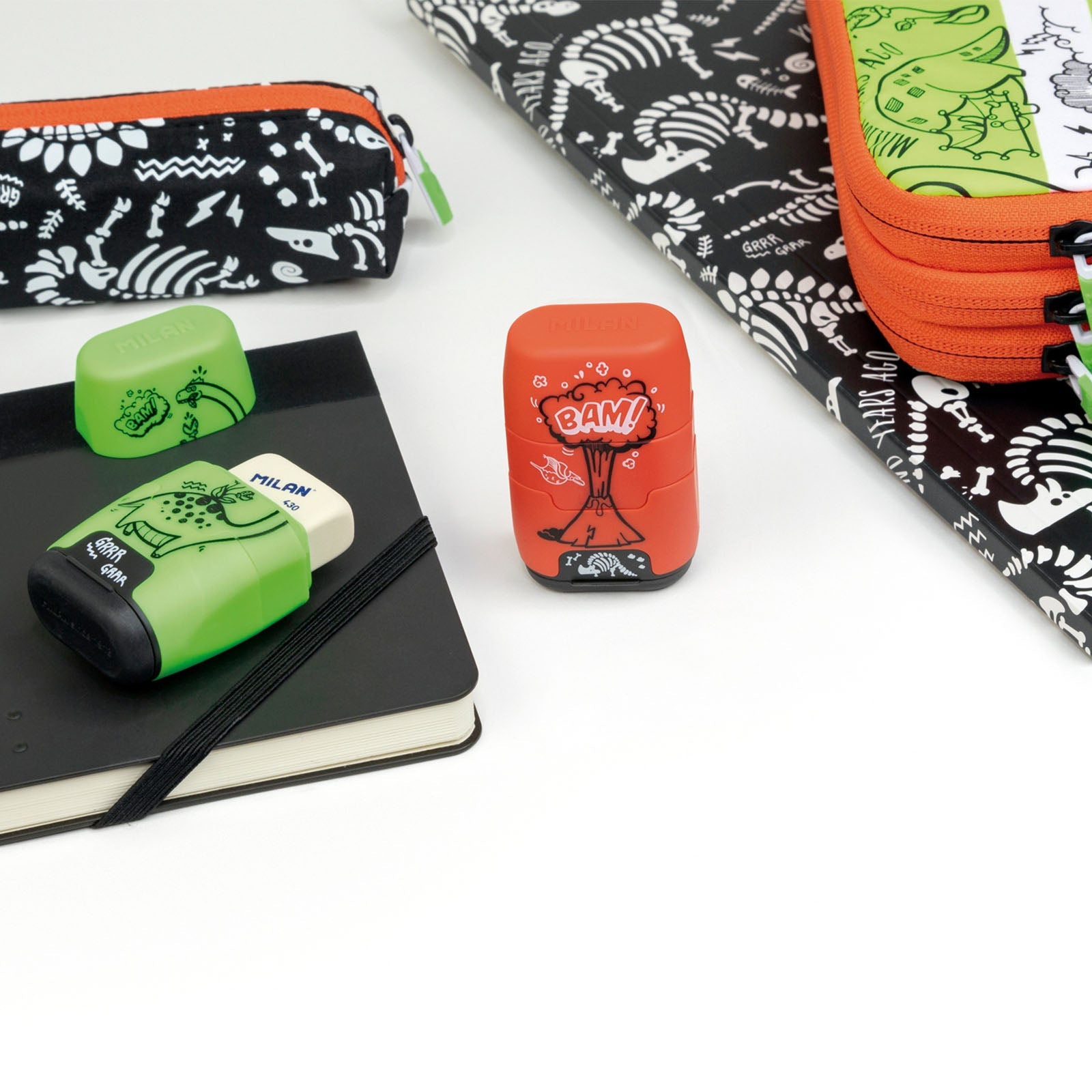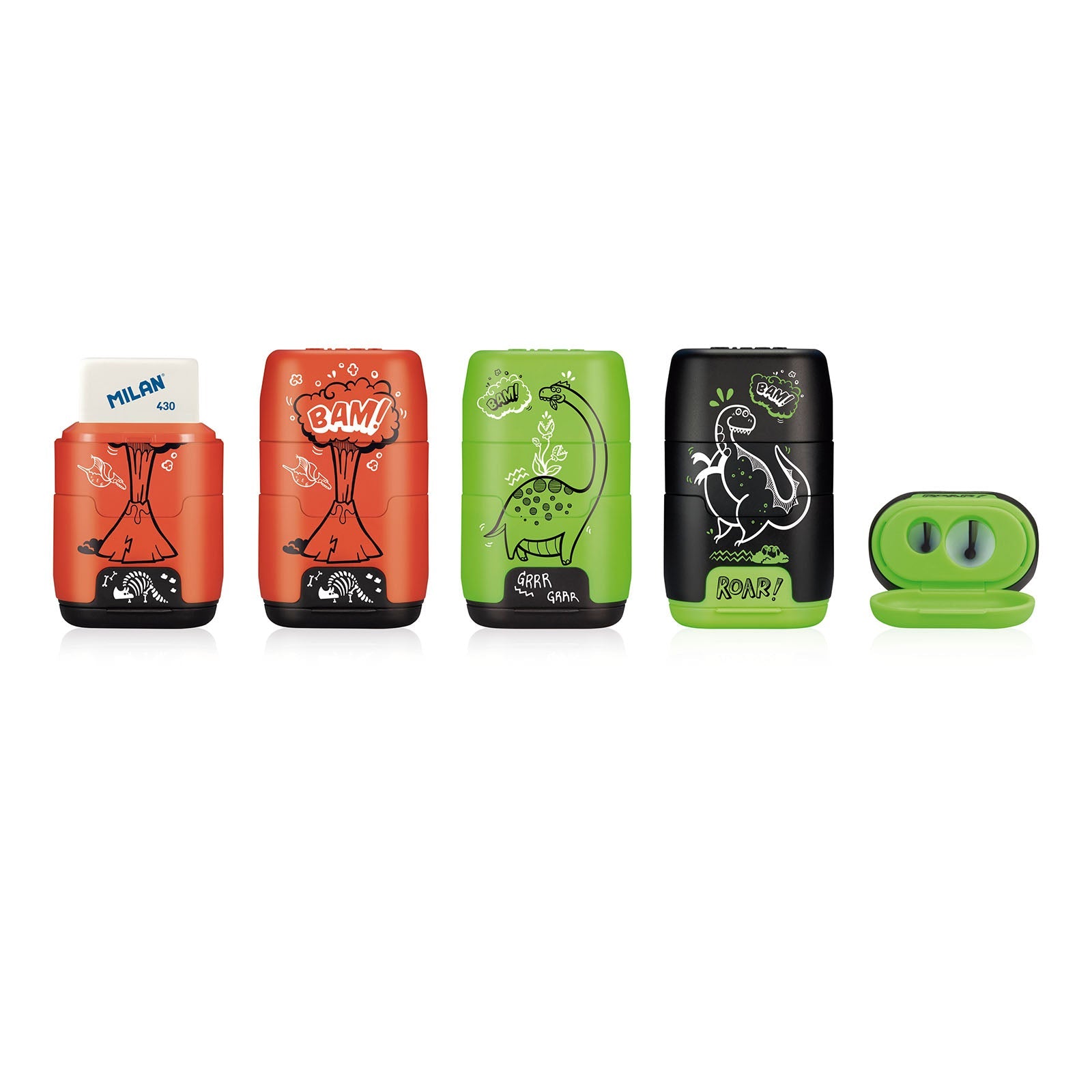 Combinación de goma y sacapuntas doble (uno estándar y otro MAXI). Goma cuadrada suave de caucho sintético tipo "miga de pan". El sacapuntas tiene una cuchilla de acero al carbono afilada y resistente, ideal para todo tipo de lápices. Artículo con cuchilla de seguridad. Este sistema evita que se pueda separar la hoja del cuerpo del sacapuntas, siendo óptimo para uso escolar y para llevar en el estuche. Diseñado en España por el propio departamento de I+D de MILAN. Colores surtidos disponibles: negro, naranja y verde.