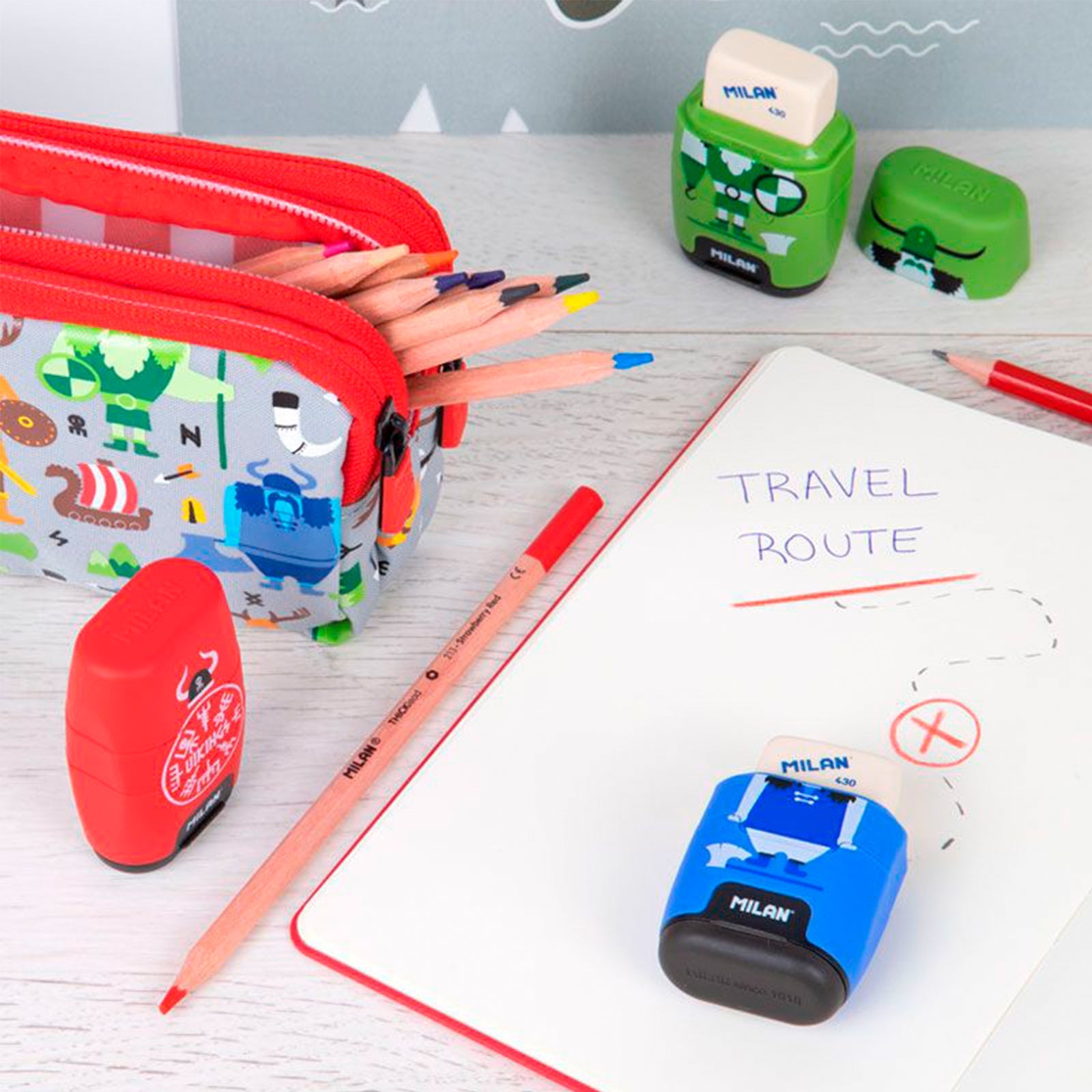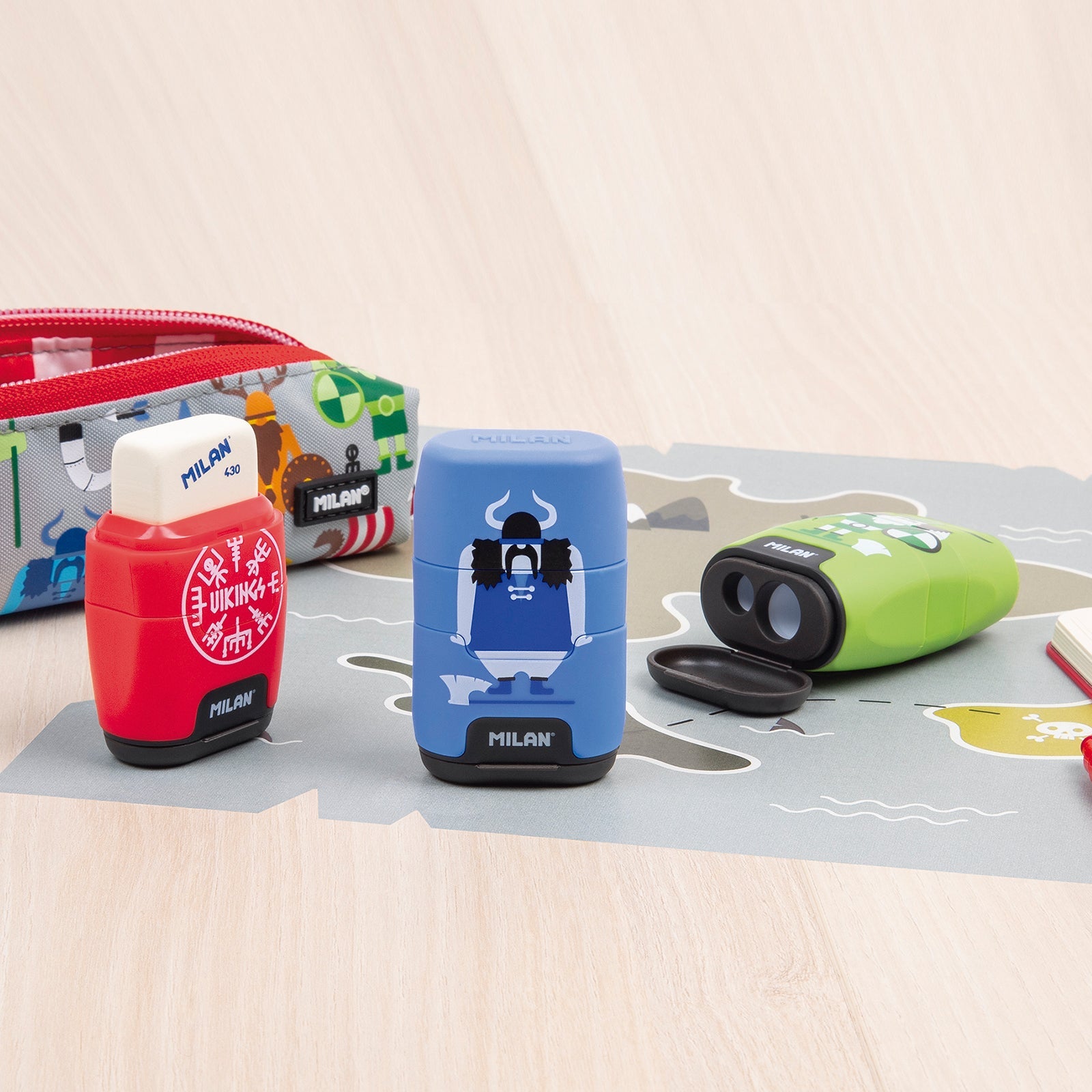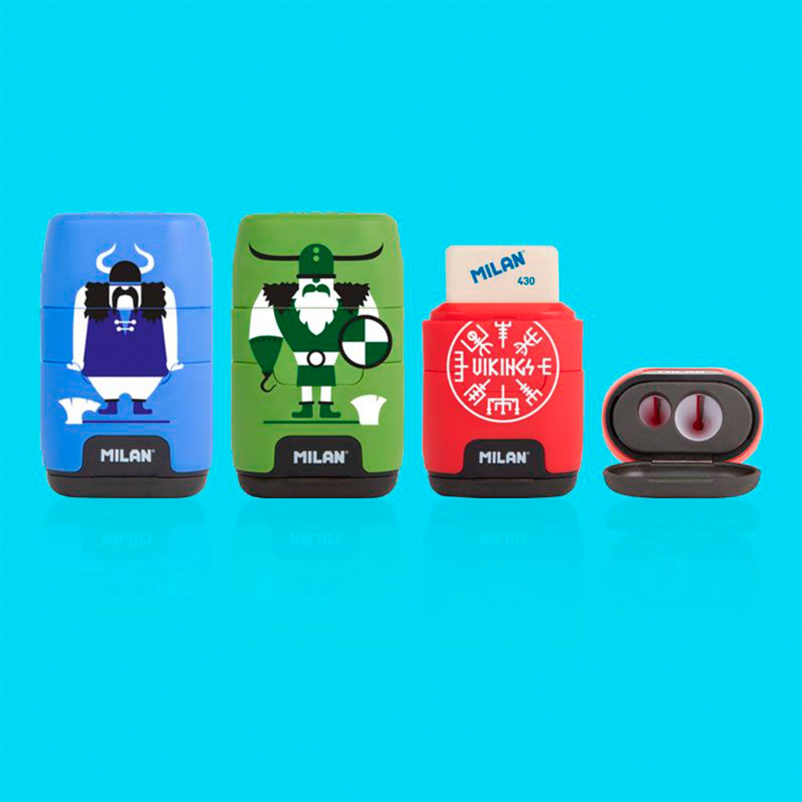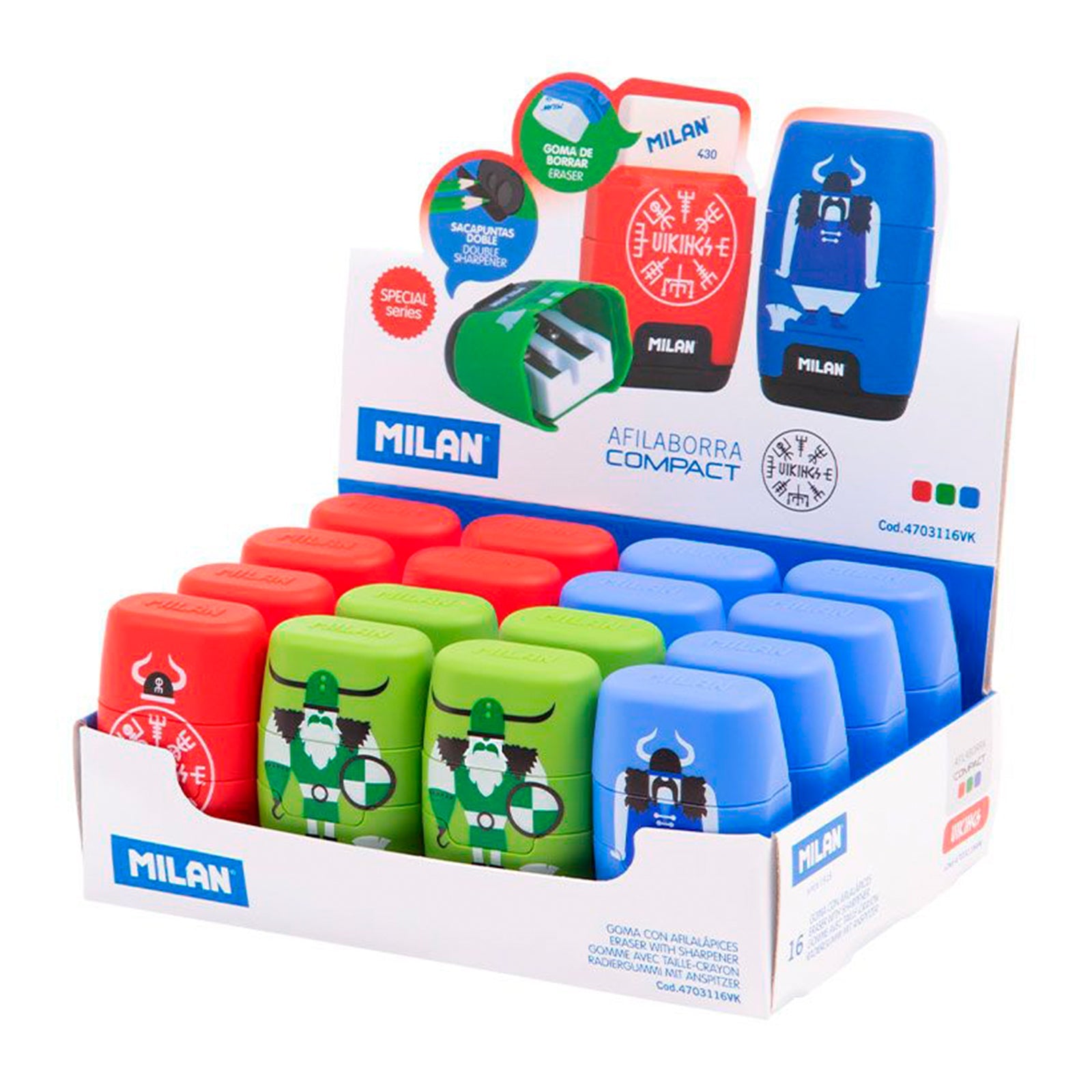 Afilaborra MILAN COMPACT serie Vikings, una combinación de goma de borrar y sacapuntas doble (uno estándar y otro MAXI) con depósito. La goma cuadrada es suave de caucho sintético tipo 'miga de pan' y el sacapuntas dispone de una cuchilla de acero afilada y resistente, ideal para todo tipo de lápices.