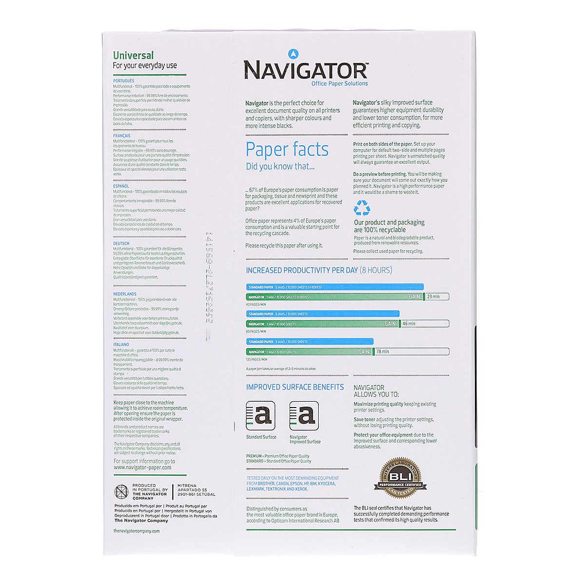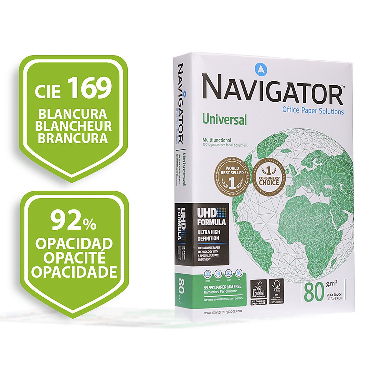 Papel / Folios fotocopiadora Navigator DIN A4 80 gramos papel multiuso ink-jet y laser, paquete de 500 hojas. Trabajos a dos caras, ink-jet, láser color y b/n. 100% garantizado en todos los equipos de oficina. Comportamiento inmejorable: 99,99% libre de atascos.