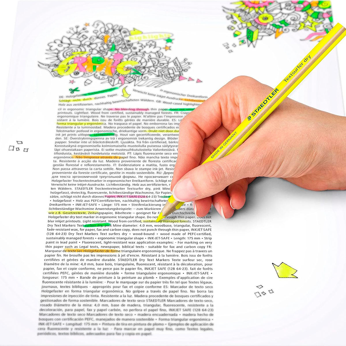 Set de 4 lápices de madera jumbo STAEDTLER Textsurfer tipo marcadores fluorescentes en seco. Diseño triangular ergonómico con un diámetro de mina de 4 mm. Ideal para resaltar sobre papel, copias, fax y/o inkjet.